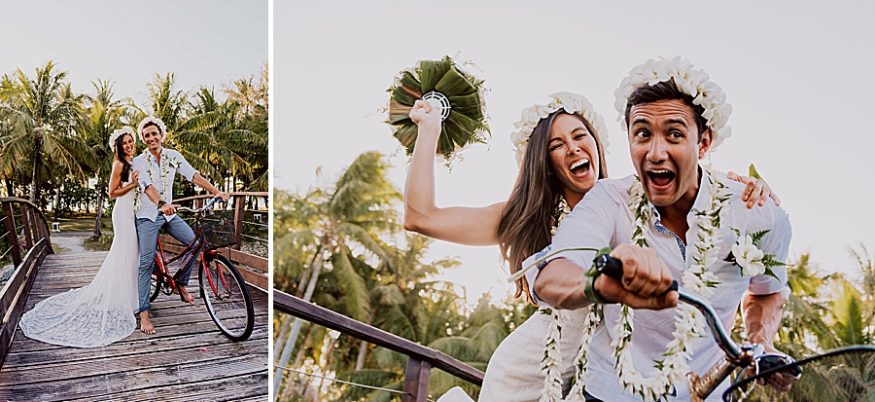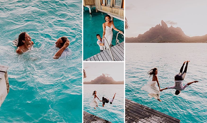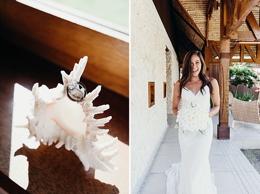 This gorgeous elopement in Bora Bora was the perfect cure for my winter blues! Kim and Gadi traveled to The St. Regis in Bora Bora to say their I do’s. They embraced the local Polynesian wedding traditions by including flower crowns and leis and a spin on the handfasting done with the Auti leaf. The priest makes bracelets from the leaves and literally “ties the knot” together before a water blessing with water from a conch shell.