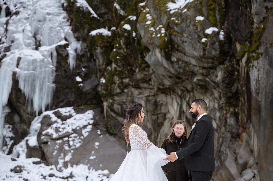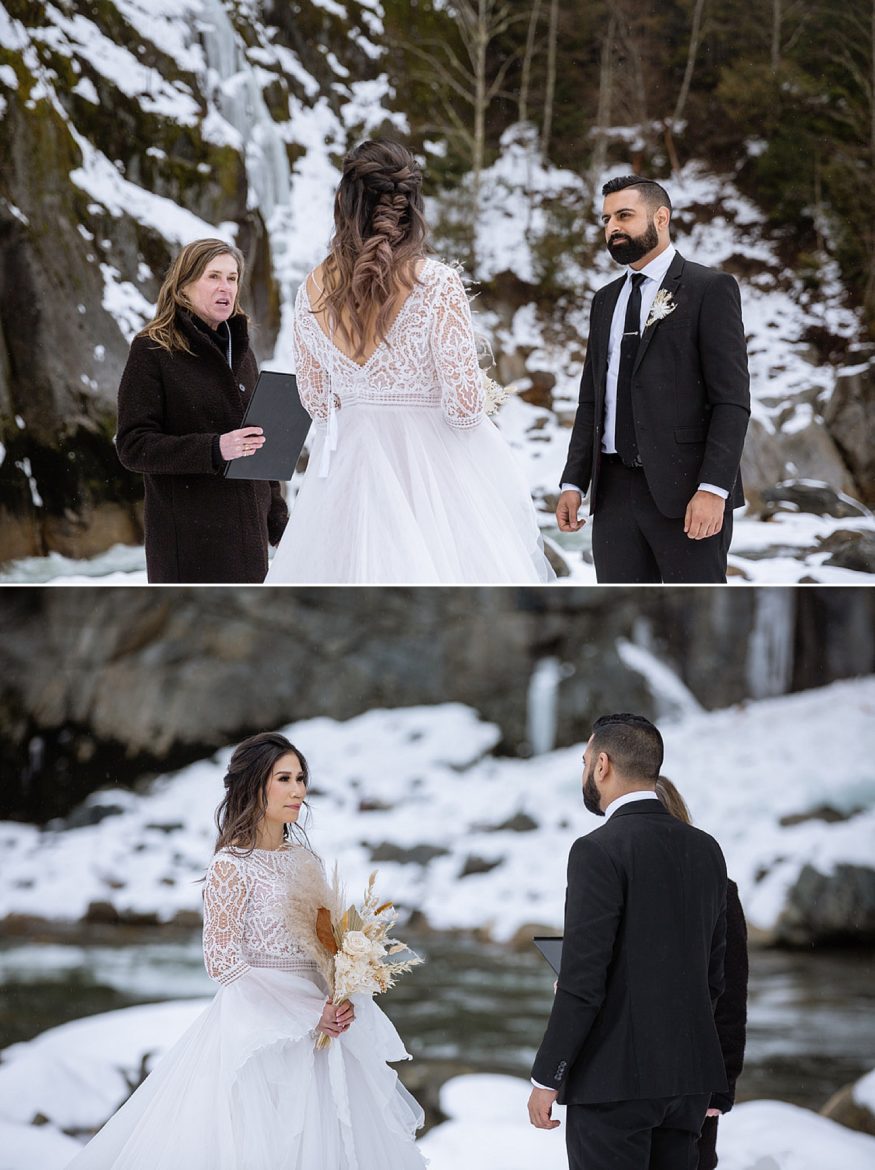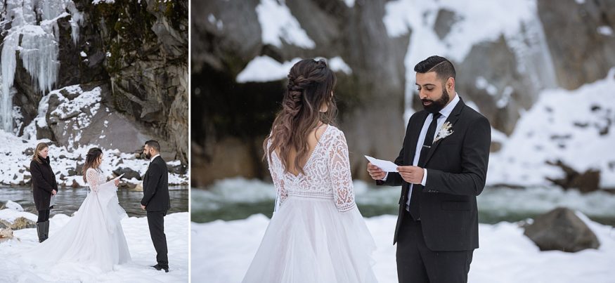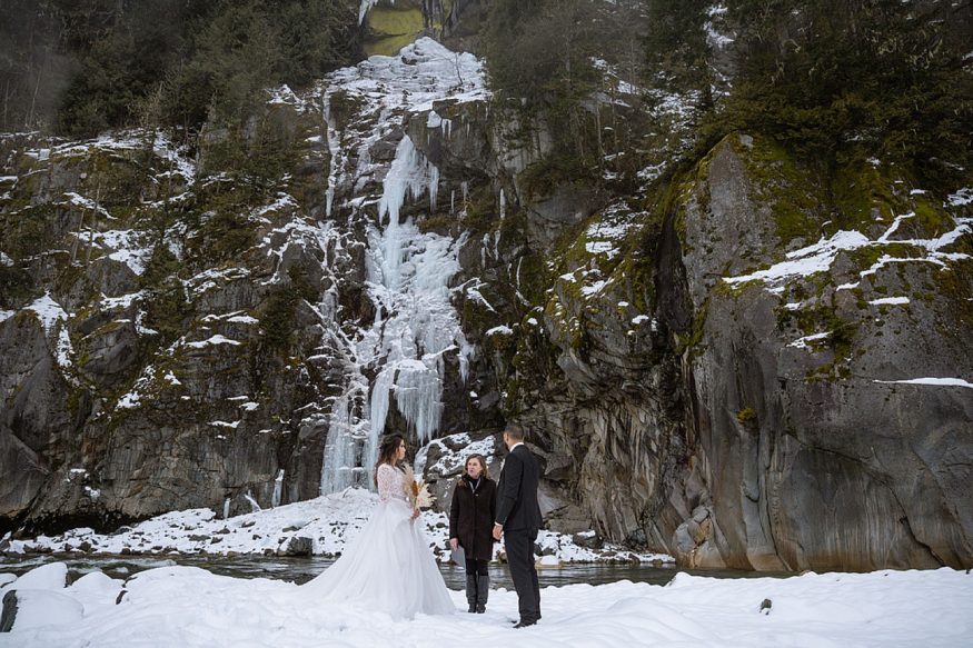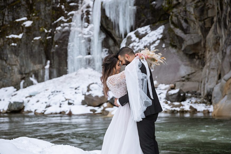 The location we chose at the Squamish river runs close to beautiful cliffs, which made the spot for the ceremony extremely gorgeous and secluded. Due to cold weather, the waterfalls on the cliffs had frozen over, which created a magical backdrop for Caroline and Gurm’s wedding. The ground was covered with snow and made the scene look like a winter fairytale.
