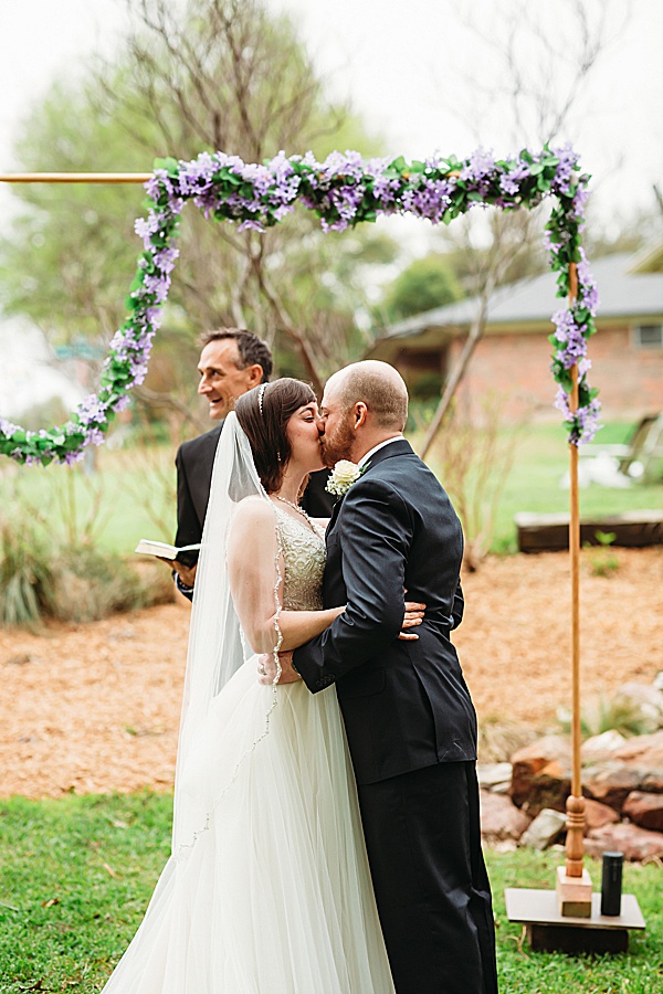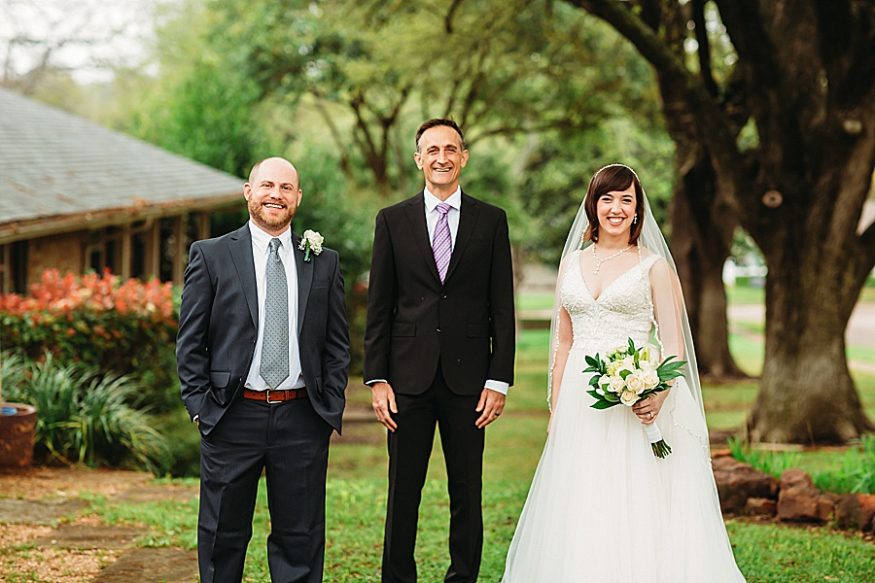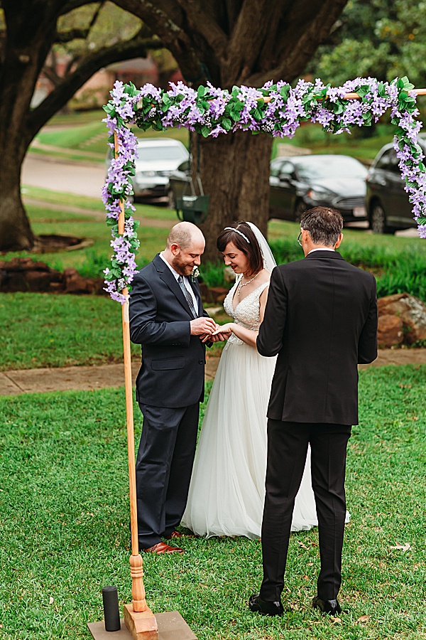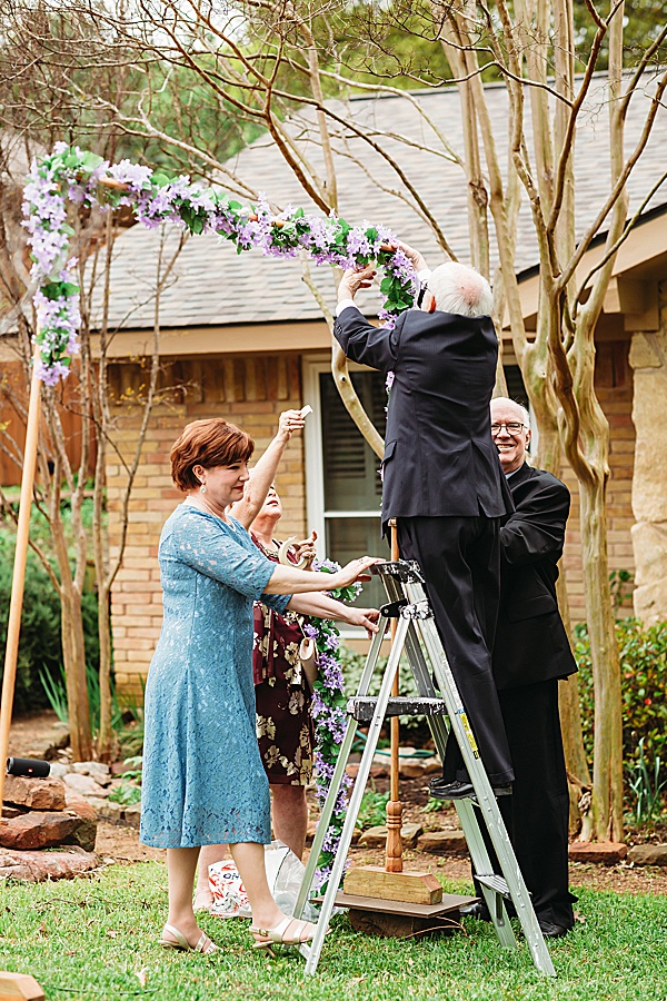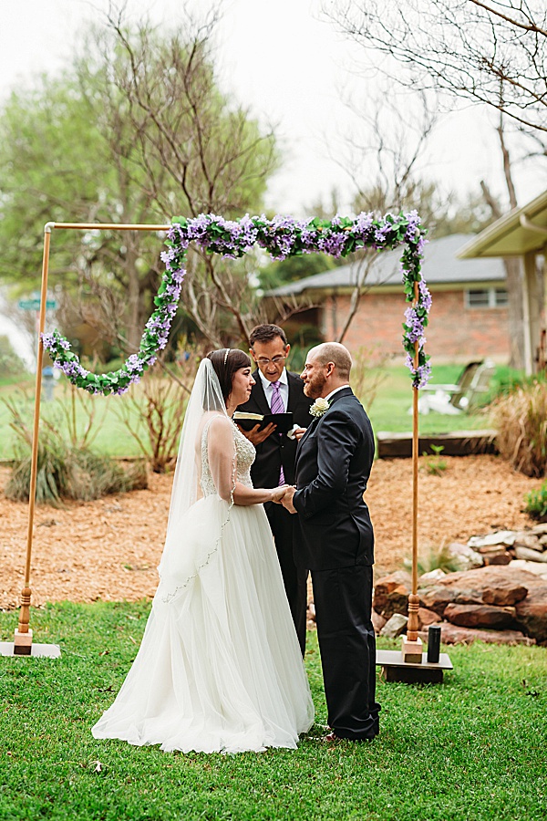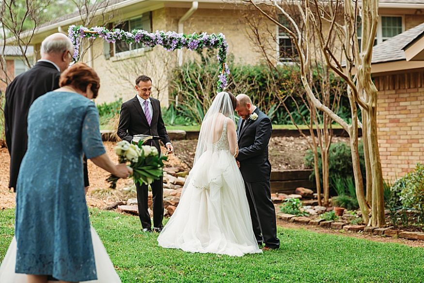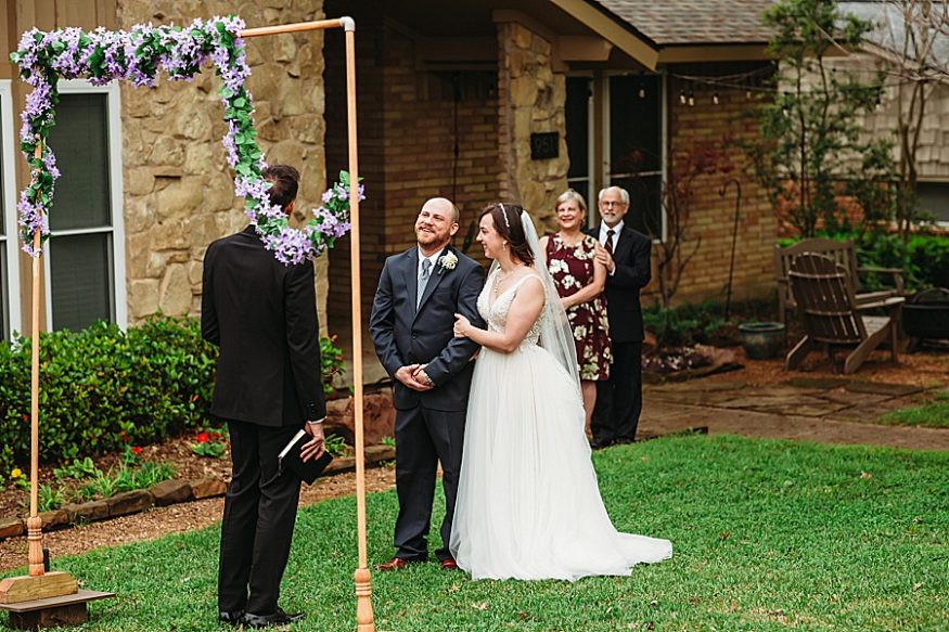 We did not have any intentions of eloping. We had finalized plans to have our ceremony and reception at the Cliff House in Bishops Arts area of Dallas on April 5 with about 100 guests. As things progressed with the pandemic and businesses had to be closed and gatherings continued to be reduced in size it kind of forced our hand. Our back up plan was to have reception at a later date but still be married on April 5, but maybe in the church courtyard with only family. When the shelter in place was ordered we had to change those plans as well. We then decided what was important was us being married and beginning our lives together as husband and wife. We called our pastor up and asked him if he perform the ceremony the next day, Monday, March 23. Deciding at 9pm to have a wedding the next day at 4pm makes you prioritize whats important to have. We quickly called the photographer, and huge blessings she was available to be there. the next morning, Darren worked on getting his suit, music set up, and trellis ready and Darci went to Krogers’s for flowers and assembled her and Claire’s bouquets with a friend. Since our original wedding day was only 2 weeks away, I already had my dress ready.