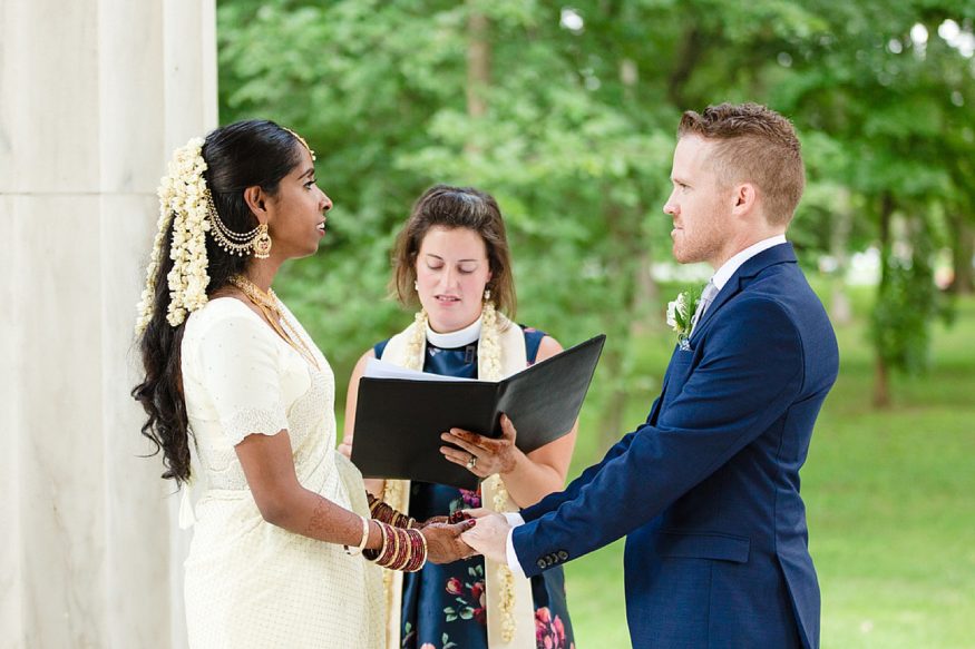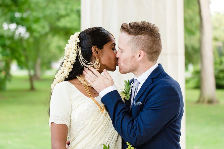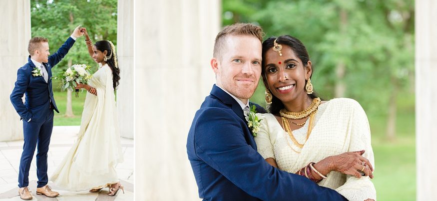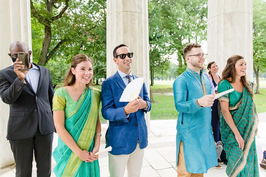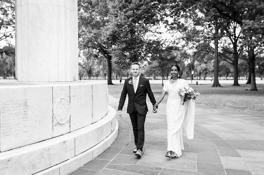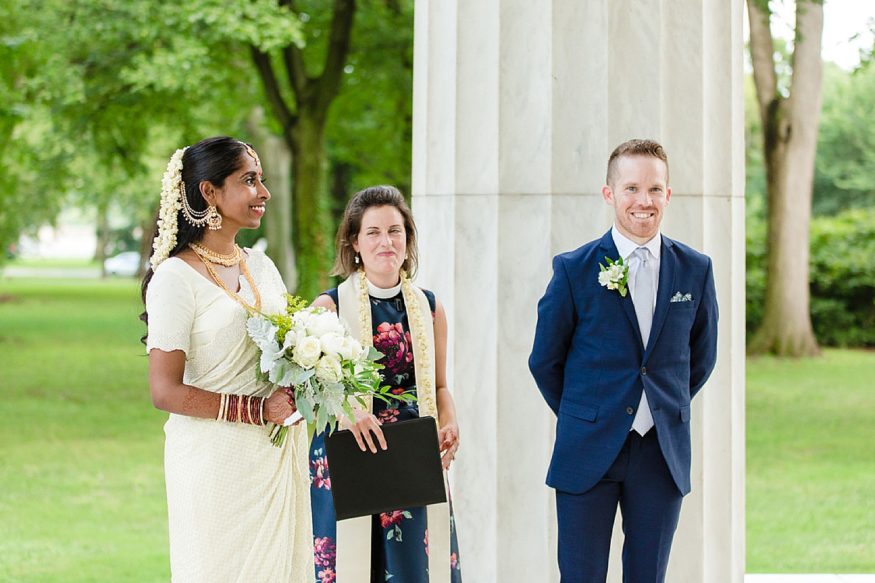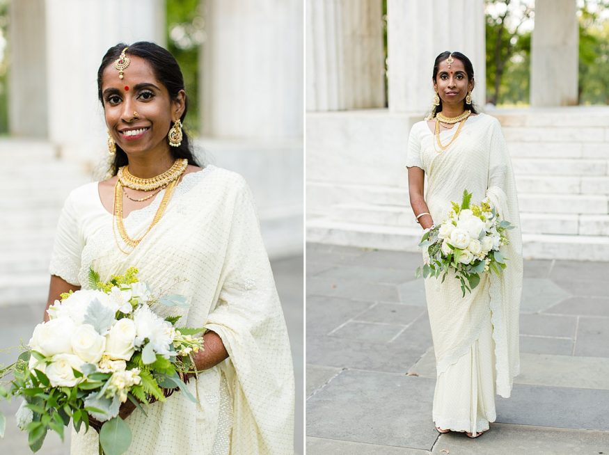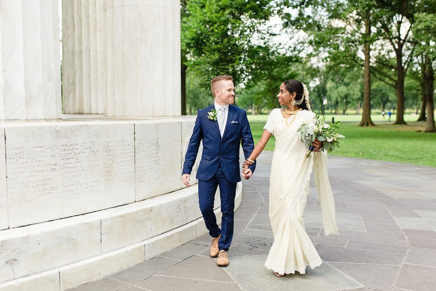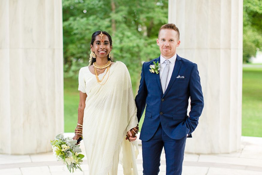 A: Our wedding was not the one we spent a year planning, but in the end it was perfect. We had to cancel our May wedding because of COVID-19 . Initially we tried to reschedule, but soon it became more clear that COVID was not going anywhere, anytime soon. We ended up doing a small intimate ceremony at the DC War Memorial. We had just 15 guests including our officiant who is also my sister in law. I wore my white sari and Patrick wore a navy blue suit, which looked absolutely classic and endlessly elegant at the Memorial. Patrick’s twin brother played a lovely Hawaiian song on the ukulele as my best friend walked me up the stairs and to the center of the memorial (Patrick grew up in Hawaii). We had a camera set up as well which allowed a 100 plus people to attend from around the globe as I have family in India, Ireland, UAE and beyond! Our friends and family who were present at the ceremony said it was one of the most beautiful weddings they have been to. The size definitely made the occasion tremendously intimate and raw. It was also amazing to be able to sew some love in the world in a time when nothing felt safe in the world anymore.