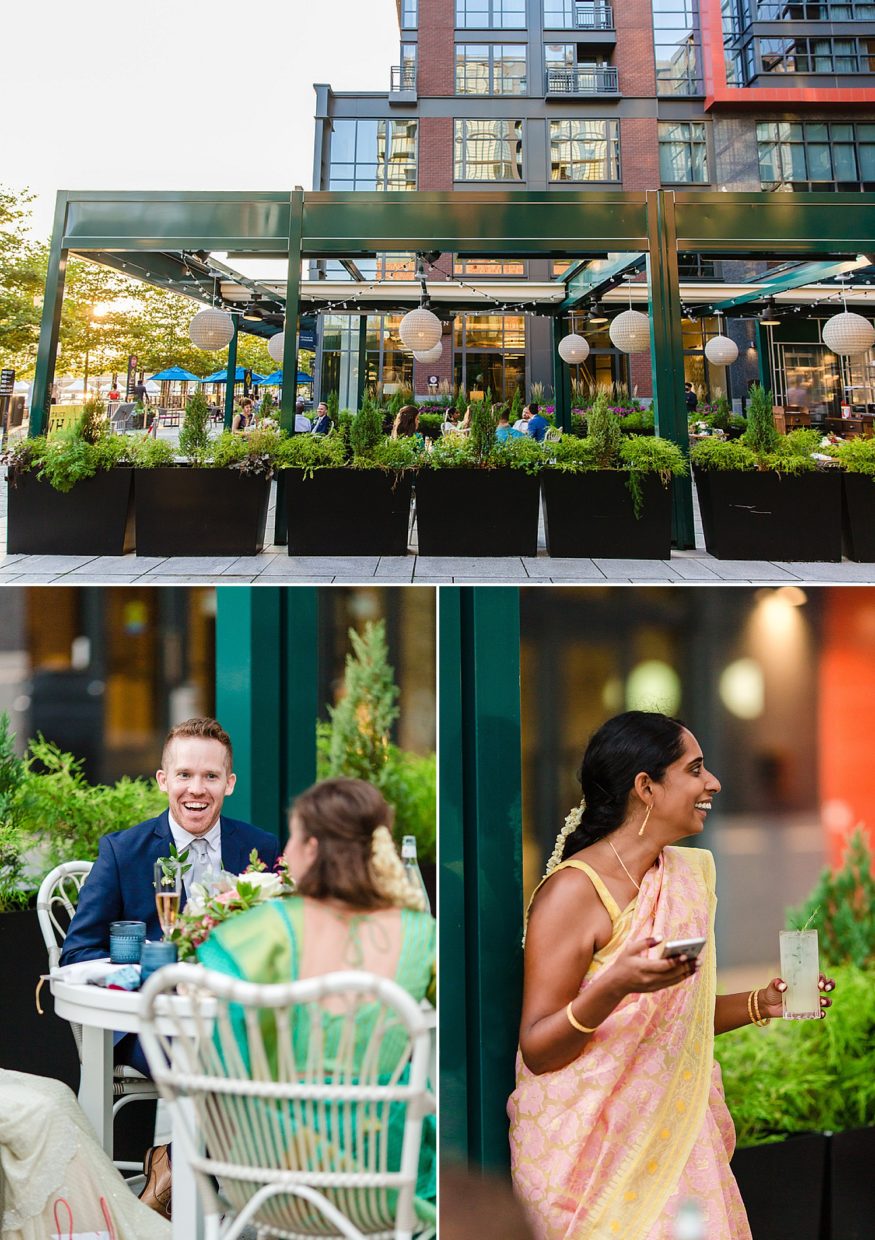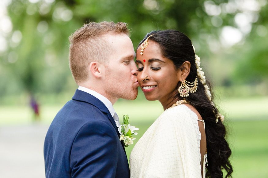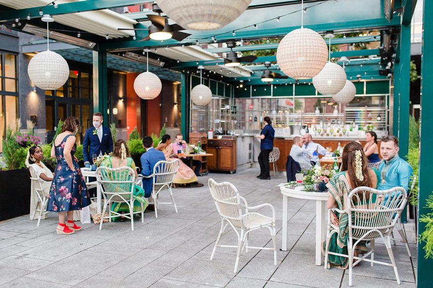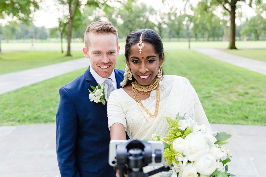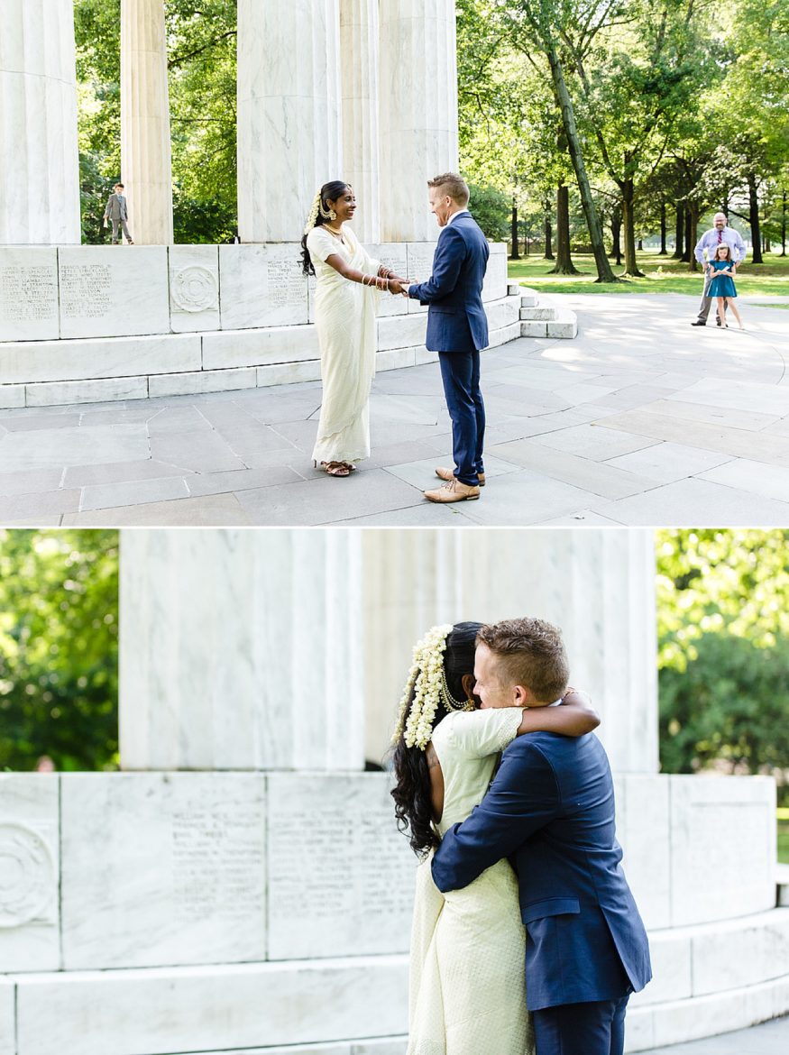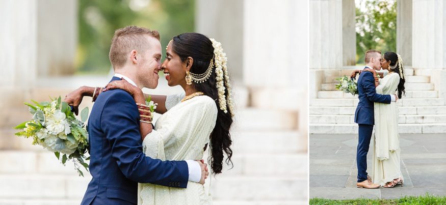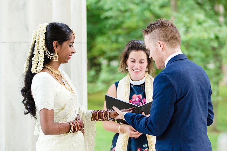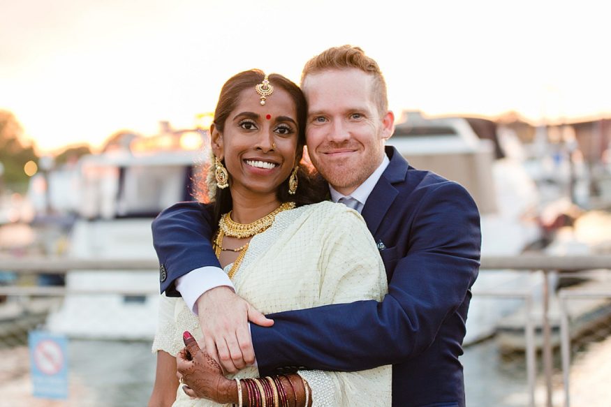 A: Our wedding was not the one we spent a year planning, but in the end it was perfect. We had to cancel our May wedding because of COVID-19 . Initially we tried to reschedule, but soon it became more clear that COVID was not going anywhere, anytime soon. We ended up doing a small intimate ceremony at the DC War Memorial. We had just 15 guests including our officiant who is also my sister in law. I wore my white sari and Patrick wore a navy blue suit, which looked absolutely classic and endlessly elegant at the Memorial. Patrick’s twin brother played a lovely Hawaiian song on the ukulele as my best friend walked me up the stairs and to the center of the memorial (Patrick grew up in Hawaii). We had a camera set up as well which allowed a 100 plus people to attend from around the globe as I have family in India, Ireland, UAE and beyond! Our friends and family who were present at the ceremony said it was one of the most beautiful weddings they have been to. The size definitely made the occasion tremendously intimate and raw. It was also amazing to be able to sew some love in the world in a time when nothing felt safe in the world anymore.