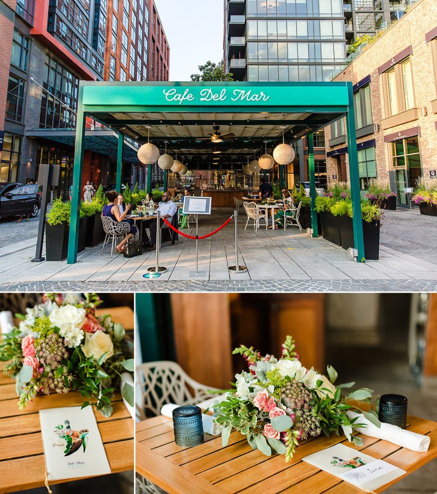 A: Though we had already purchased table runners, candle holders, and other décor for our May wedding, we did not use much at the Memorial. The beauty of the structure itself was more than enough. At Del Mar, where we had a private reception in Del Mar’s outdoor ‘cafe’, the restaurant did a flawless job making everything beautiful.