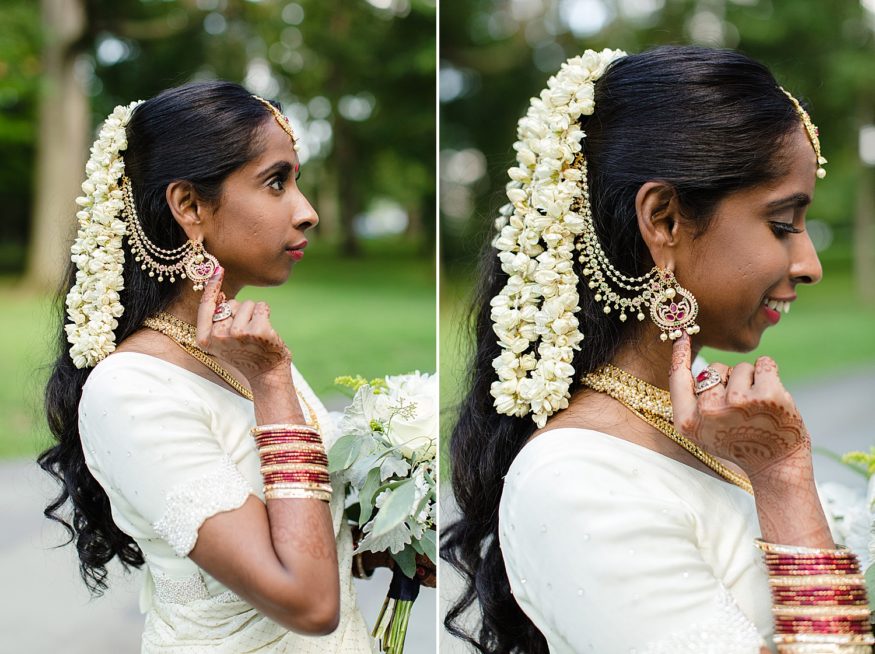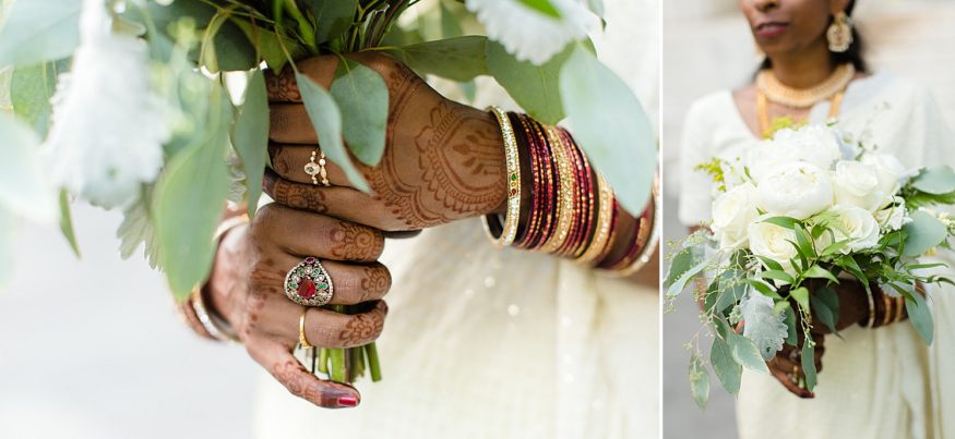 A: Patrick wore a simple and classic navy blue suit that he already owned with a slim black tie. I wore a traditional Indian sari. The sari was cream with gentle gold accents threaded into the fabric. I also had the joy of wearing more jewelry than I ever have before! From a head piece to earrings that were threaded into my hair to the intricate henna on my hands; I looked like the bride I have always wanted to be.