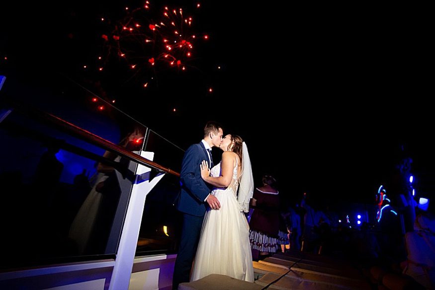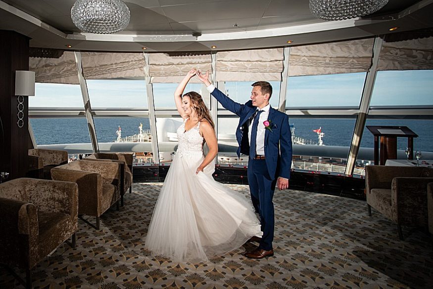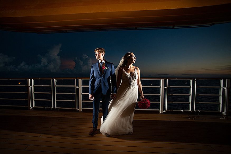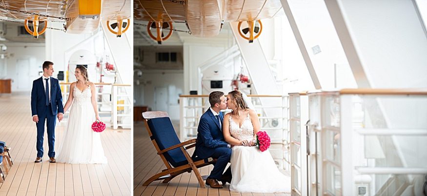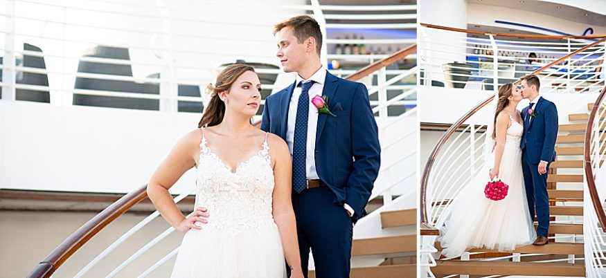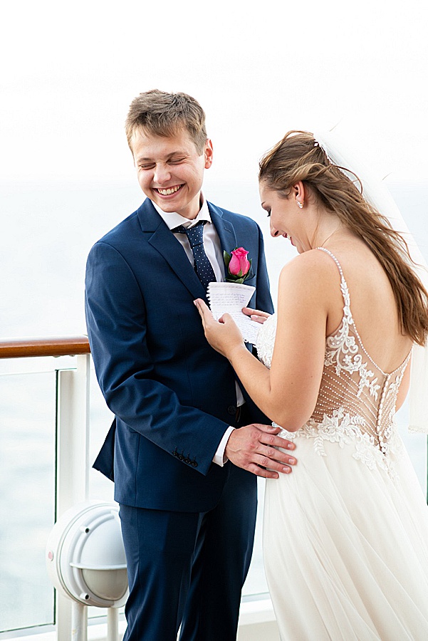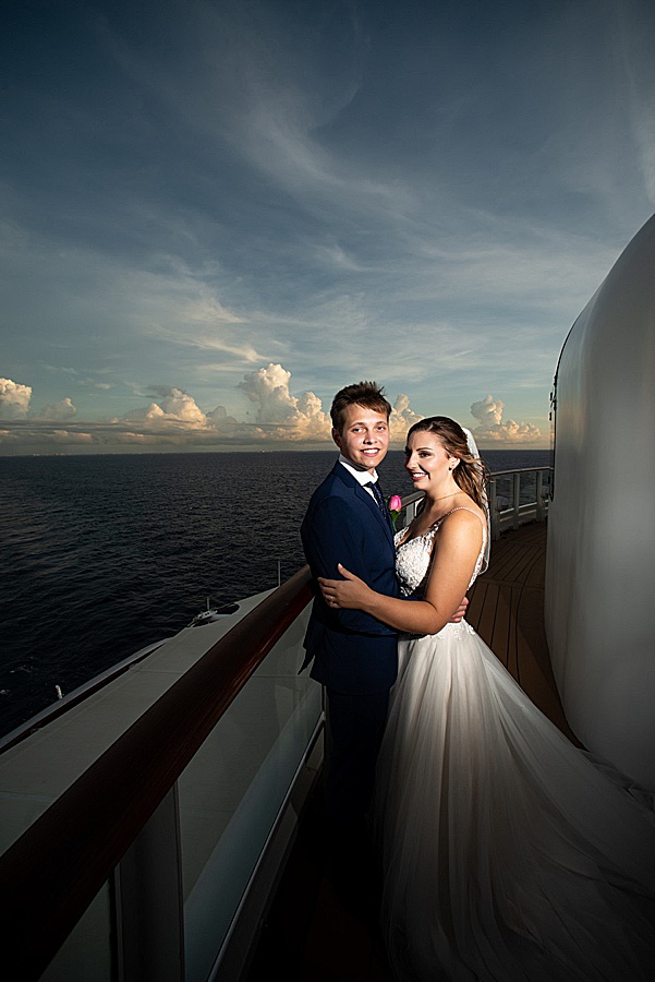 My favorite part of the day was, by far, our personal vows. We opted to only do traditional vows during the ceremony and then take some time after the wedding to read out written vows to each other. After some photos we found a secluded deck and read each other these vows. It was so nice read each other such special words while sailing through the sunset. Stephanie, our photographer, was there to take photos and they ended up being some of our favorite photos from the day! I would totally recommend any couples that be anxious about reading vows to do this on their own after the fact. A close second favorite part was when we went to the club venue on the ship that night in our wedding attire and danced the rest of the night. We got so many congratulatory wishes from random people on the ship, it was so nice of them!