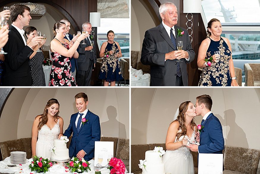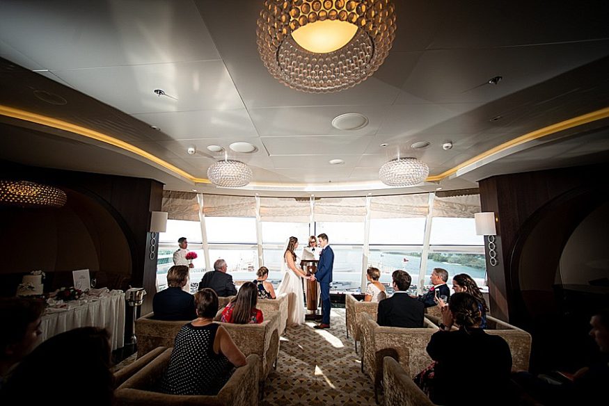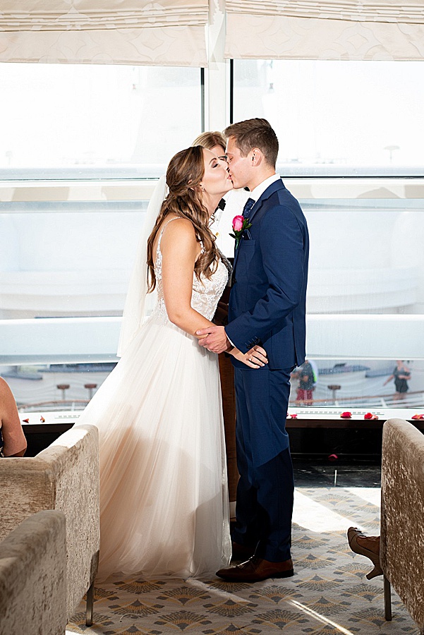 This lead me to the on board options. When booking an on board wedding you have the option of booking the main Atrium or you can be assigned a space 45 days prior. I was not interested in the Atrium at all. While it is BEAUTIFUL I just wasn’t into the idea of strangers looking over the balcony watching me cry. Also, it seems like a less controlled environment than a private room, what if a child was crying uncontrollably in the background? I was comfortable picking the standard on board option knowing we would probably be assigned the Outlook Lounge. This is exactly what happened and I could not have loved it more! It is a private room on the fourteenth deck with a large wall of windows. This is the perfect sized space for anyone will roughly 20 attendees. It had the perfect neutral setting and seem so far away from the other 3,000 people on the ship.