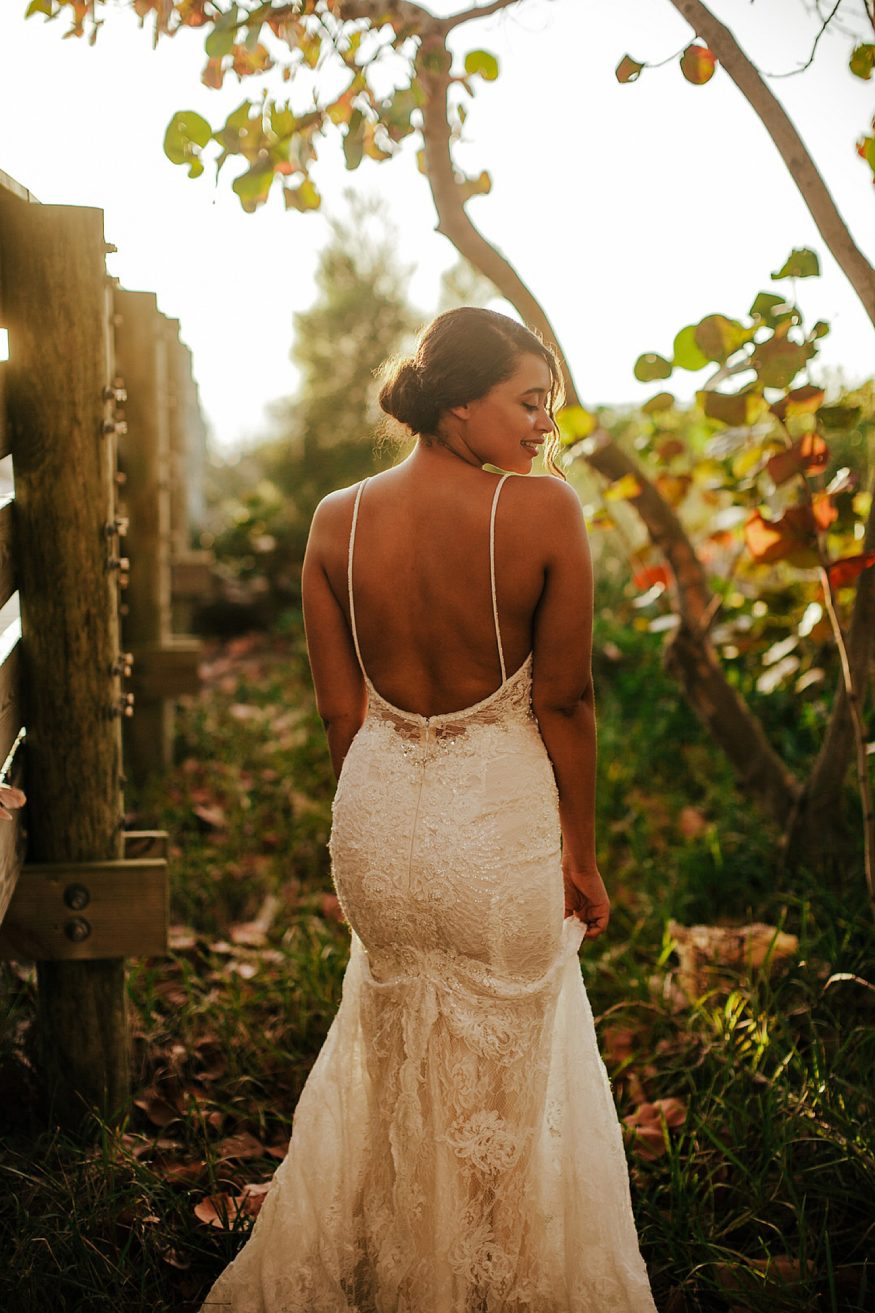 A: We are both from Iowa, and purchased our wedding attire there. My wedding gown was from Something Blue in Ankeny, Iowa. I know I really liked the dramatic mermaid look and felt like a beach wedding was the perfect setting for that. The groom chose a charcoal suit from Mr. B in Clive, IA.