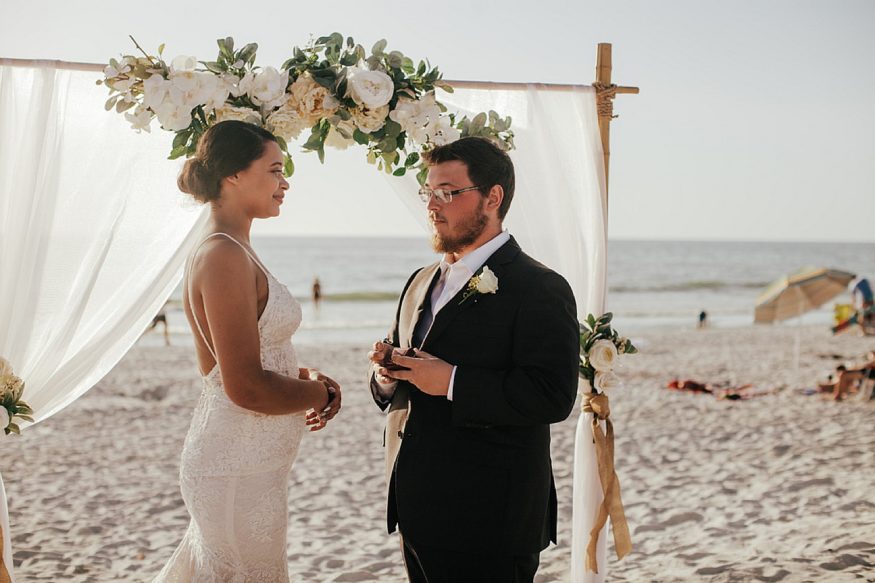 A: We had a draped arbor with floral accents on the beach as the centerpiece of the wedding. The chairs were also draped in sheer white fabric to contribute to the airy beach feel. Tide the Knot did an amazing job decorating the space!We had white florals with eucalyptus as the floral theme. This was reflected in the arbor, my bridal bouquet, and the groom’s boutonniere.
