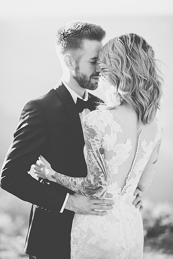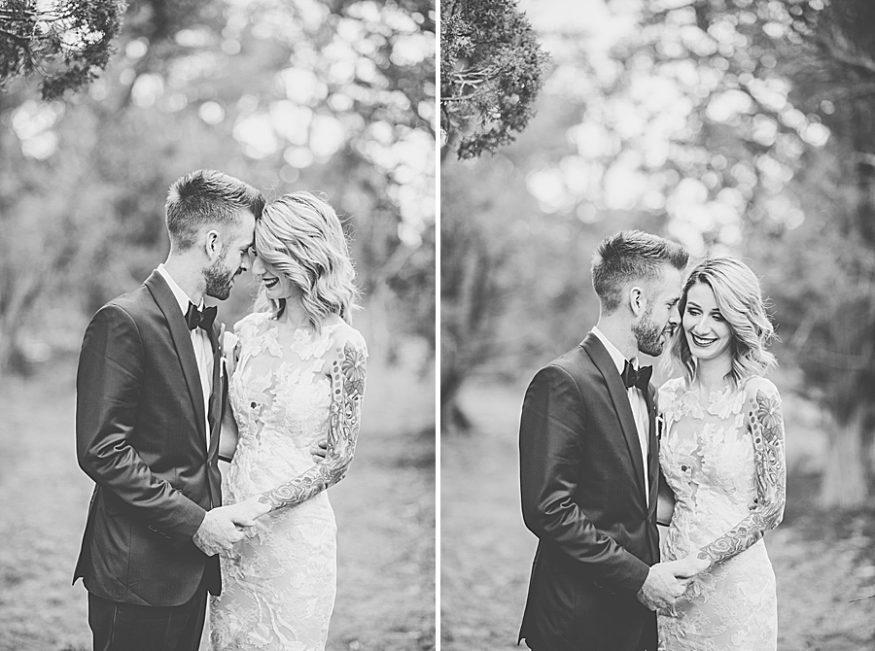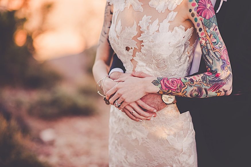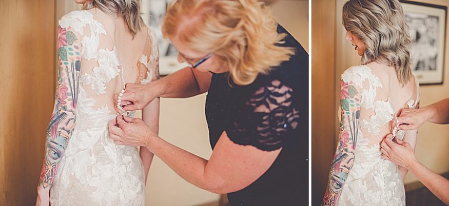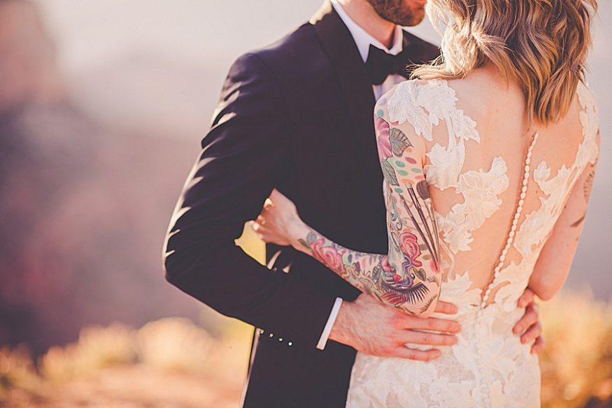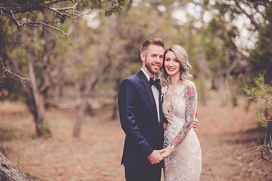 We both wanted something unique. I (Carmen) wanted something that not every bride would wear, and something that fit the style of the wedding. I chose my dress because of the lace design. It looked like it meshed with my tattoos and wasn’t a traditional floral lace. The lace on the dress resembled leaves and I fell in love the minute I tried it on. I had tried other dresses on that I thought I liked but none compared to that one. Joe found his suit at Nordstrom when we were leaving the store. We walked by it and he noticed it. He didn’t know if he should get something that “fancy” but loved it. He ordered a different one online but ended up not liking it. So he decided he should get the one at Nordstrom instead. It fit him perfectly and the color was so unique! It was meant to be!