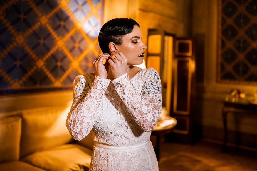 Q: Let’s talk fashion. How did you both choose your wedding day look?