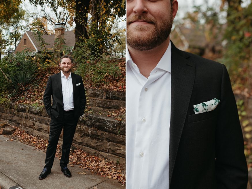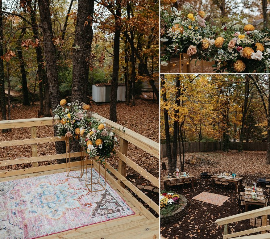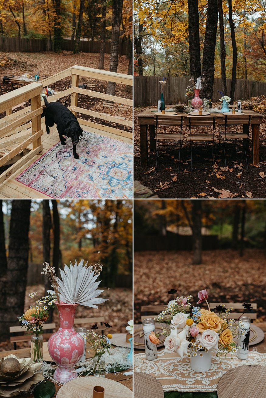 A: Since COVID we really had to take into account everyone’s safety and health. Keeping it outside was the best and safest option. And Fayetteville really did most of the work with the weather and changing leaves. We rebuilt the back deck to accommodate the integrity of the house and to allow a space for the ceremony. Family and friends helped clear out the yard and string up as many lights as possible. My mom and I (help from family) went to almost every vintage store in Fayetteville for colorful vases as table scapes. The more the better. As take away gifts and decor, I designed and screen printed prayer candles as a nod to this spiritual candle shop down the street from our house with elements of our little family and date of our wedding.