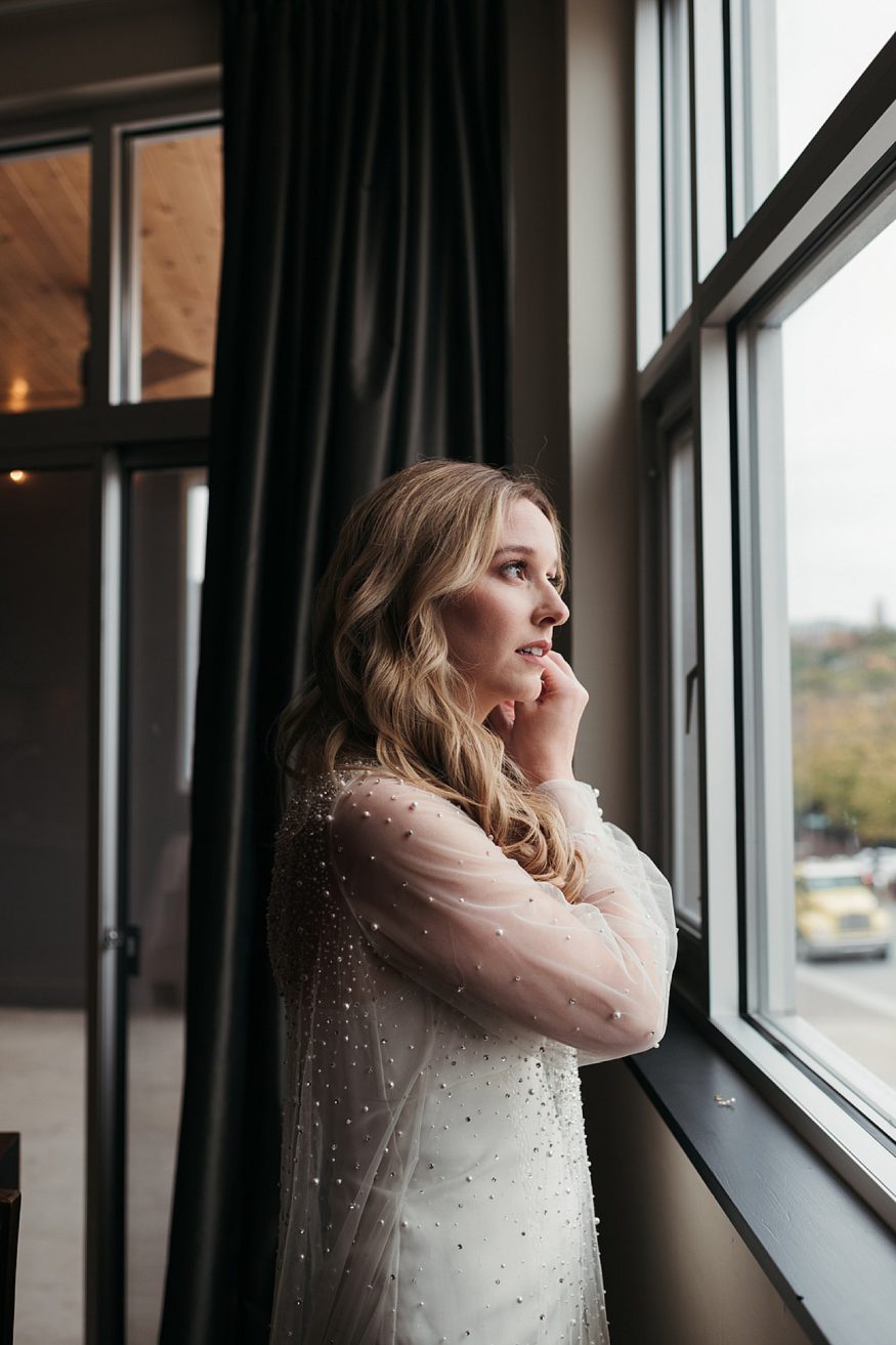 A: Patrick bought a traditional black suit and pocket square but opted out of wearing a tie to keep that laid back look/feel. He was wearing green socks with our dog, Lotte’s face on them. My dress was purchased at Tesori Bridal in Fayetteville. I wanted something different but still traditional. My mother’s dress was a long sleeved high neck wedding gown. When I found this tulle dream with long sleeves and a high neck overlay I knew this was fate. It’s embellished with rhinestones and pearls cascading down from the neck to the long train. I purchased the white dress underneath and silver shoes separately. Since the dress was so much tulle I thought a veil would be too much and wore a pearl headband instead. During the reception I wore a white faux fur jacket, white wide brimmed hat, and changed into white booties.Due to COVID our friends mom made us custom face masks, mine including some of the rhinestones and pearls off of my dress.