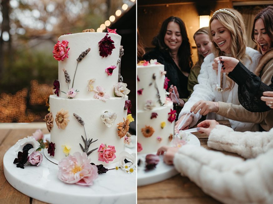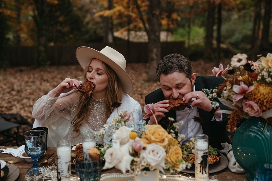 A: It was a mash up of Fayetteville/New Orleans wedding. We wanted to keep an eclectic, 70s vintage, relaxed theme for our wedding. Nothing too matchy-matchy. All types of color in vintage porcelain items & flowers to decorate with more neutral/brass items for consistency. We wanted a comfortable laid back theme when we originally planned it for a music venue (like your mother’s basement or old dive bar with knick-knacks everywhere) but due to COVID we actually had it in Patrick’s mother’s backyard, fit perfectly. We also wanted to incorporate some New Orleans flare, where we currently live. Good music, good food, good drink, good people. We did cake pulls since I didn’t really have bridesmaids but wanted to do something special for my girlfriends who’ve been with me.