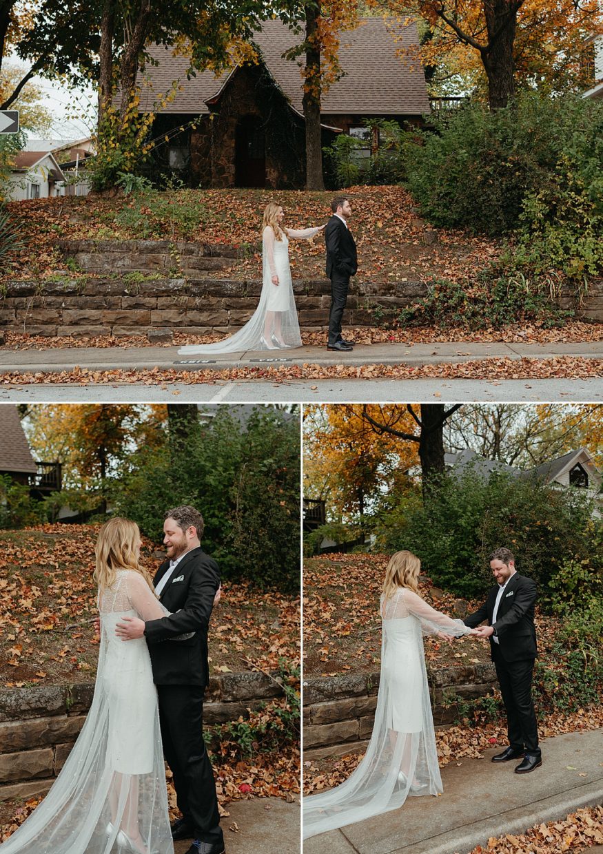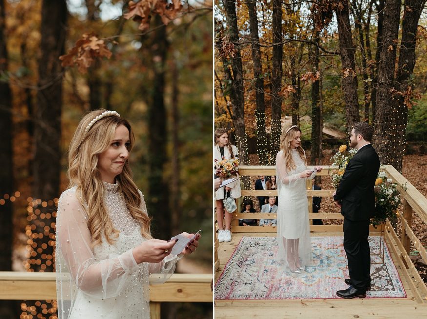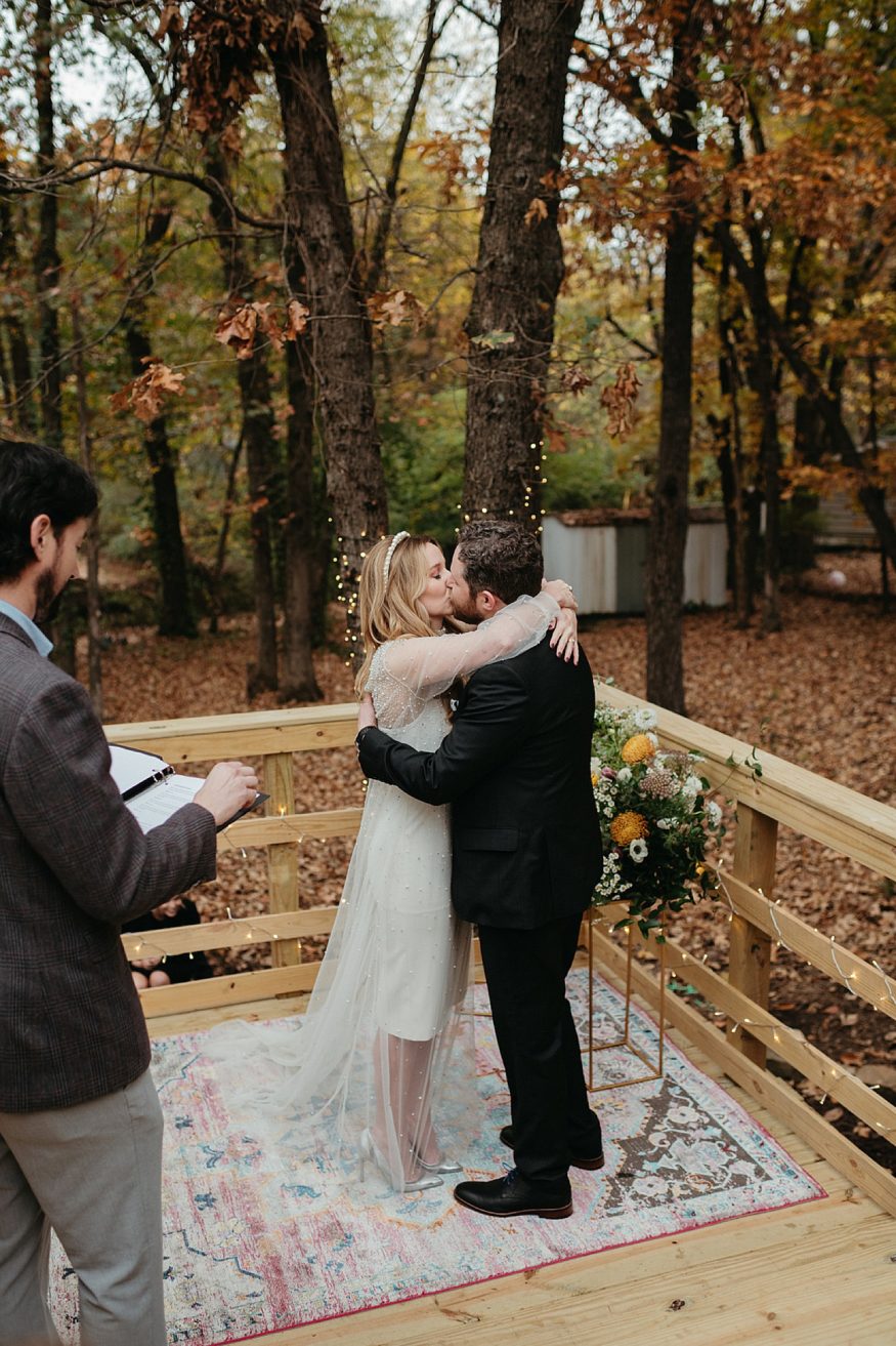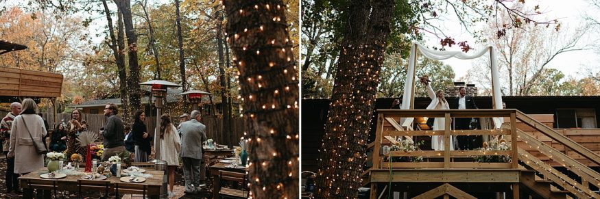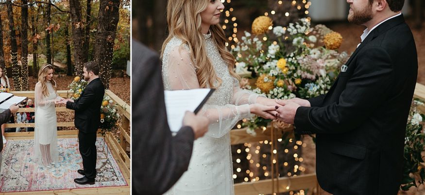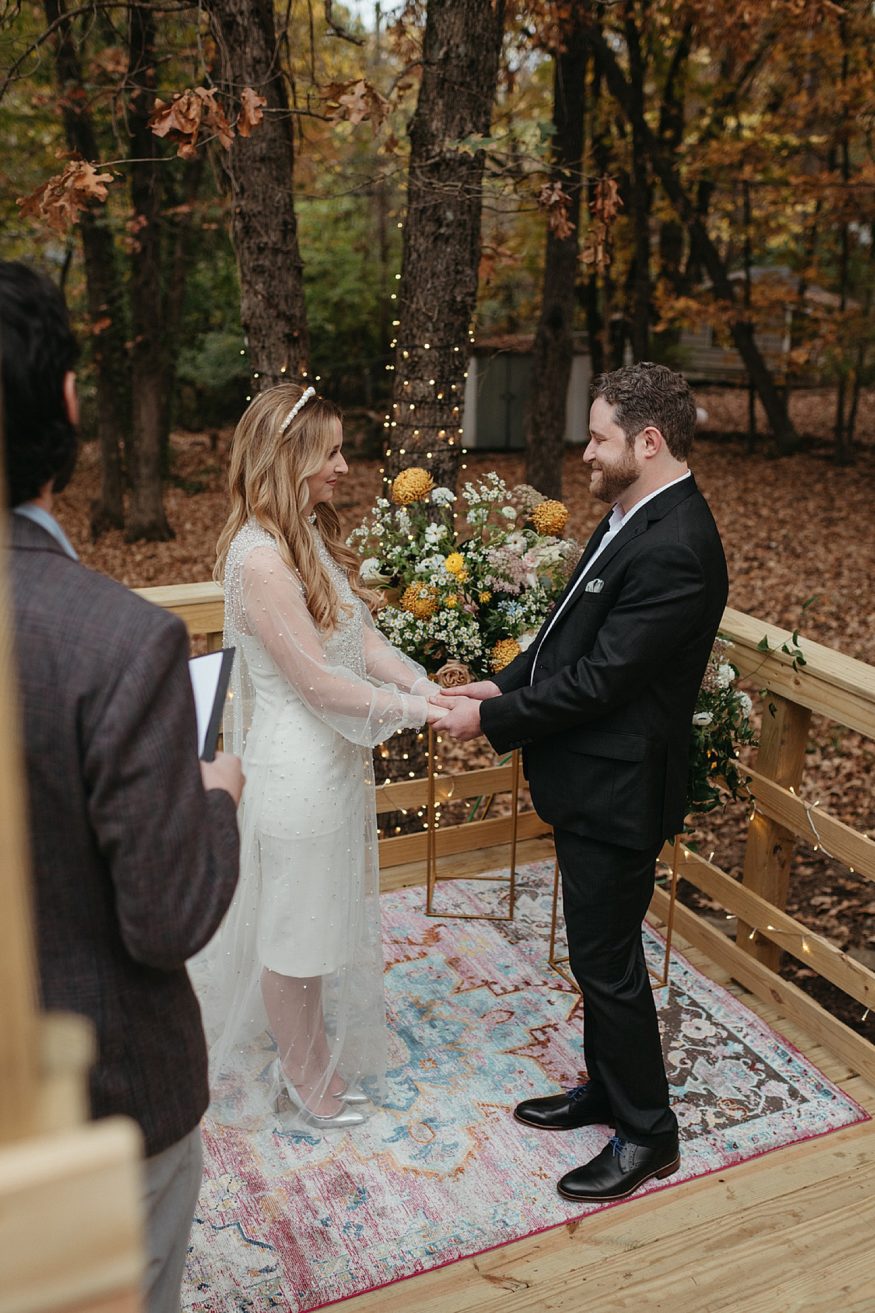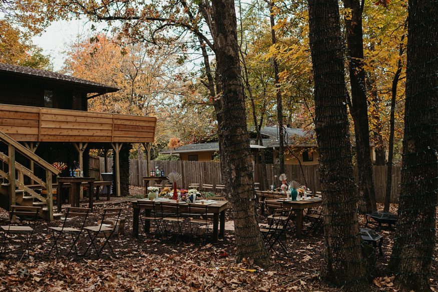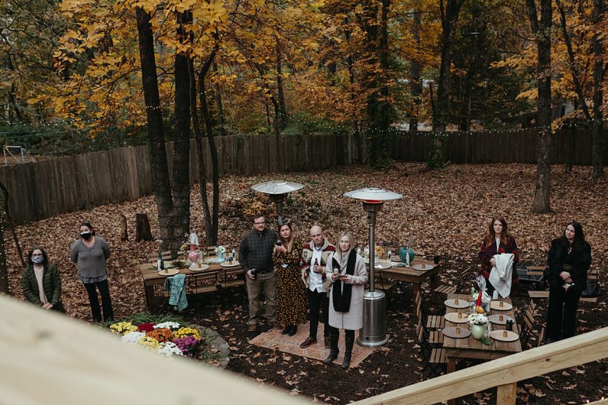 A: Since COVID we really had to take into account everyone’s safety and health. Keeping it outside was the best and safest option. And Fayetteville really did most of the work with the weather and changing leaves. We rebuilt the back deck to accommodate the integrity of the house and to allow a space for the ceremony. Family and friends helped clear out the yard and string up as many lights as possible. My mom and I (help from family) went to almost every vintage store in Fayetteville for colorful vases as table scapes. The more the better. As take away gifts and decor, I designed and screen printed prayer candles as a nod to this spiritual candle shop down the street from our house with elements of our little family and date of our wedding.
