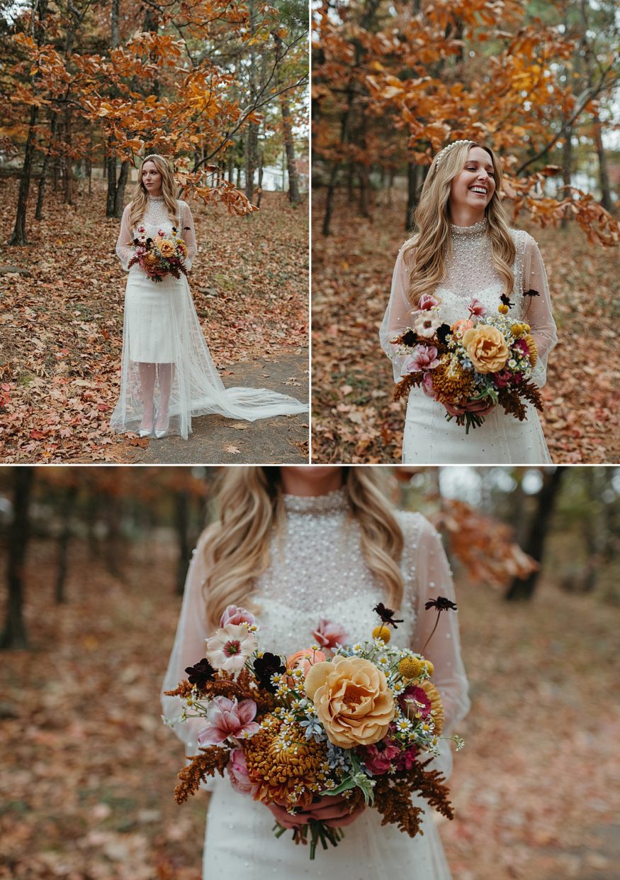 A: This is a big shout out to my ladies at Meus. I told them it was an outdoor wedding in October and I wanted lots of color with little amounts of neutrals. The bouquet was better than I could have ever imagined or asked for. Let the professionals do what they do best. Our photographer April Walsh came up with the idea for a staggered floral arrangement for our ceremony. Came out looking beautiful and created a special space. Meus also provided the small bud vases of fresh flowers for the tables which helped bring life to the table scapes. Our wedding cake was decorated with dried edible flowers. The wedding throws were dried colorful buds that were tossed when we processioned out of the ceremony and looked really cool scattered around the back yard.