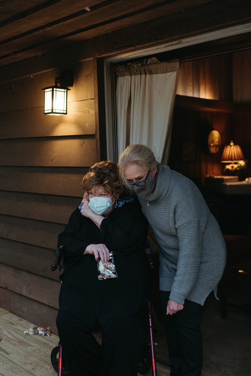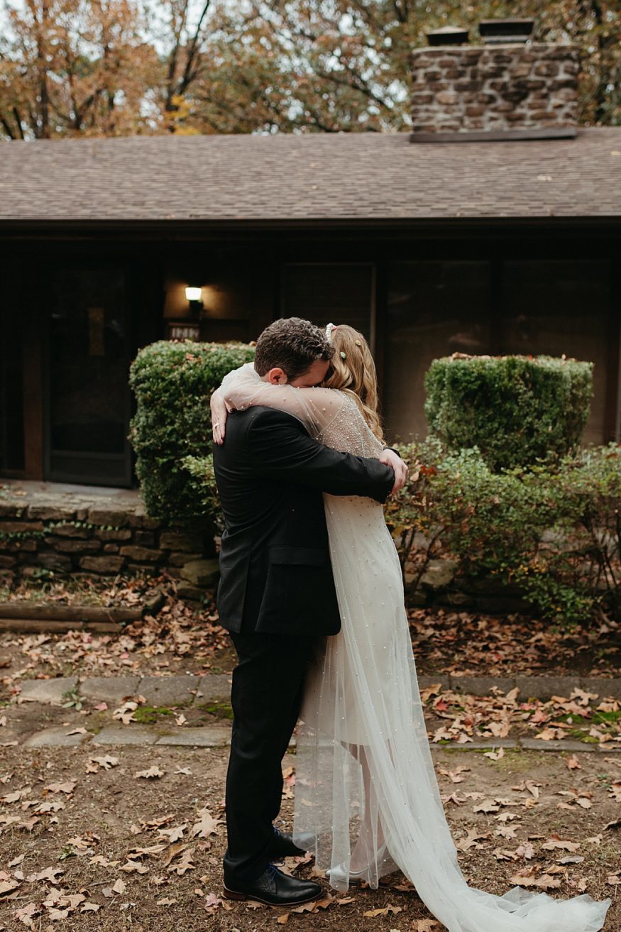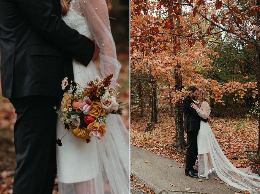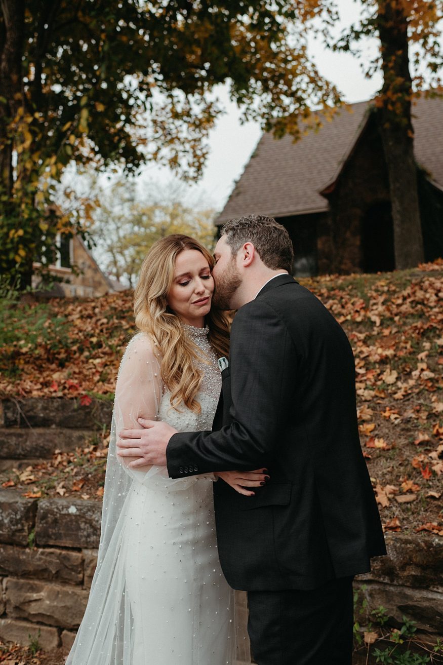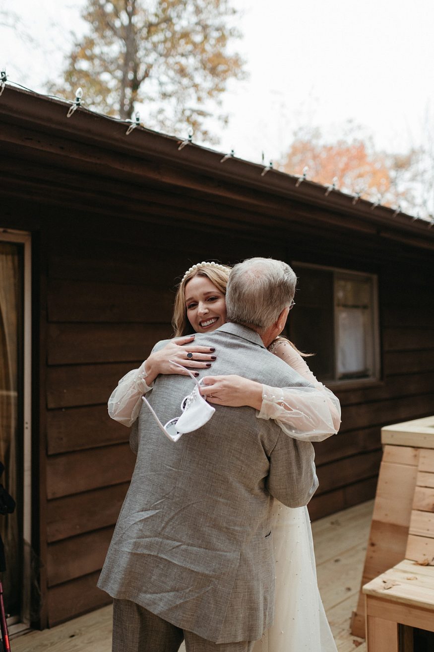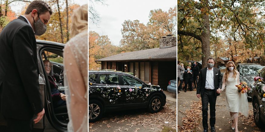 A: Patrick bought a traditional black suit and pocket square but opted out of wearing a tie to keep that laid back look/feel. He was wearing green socks with our dog, Lotte’s face on them. My dress was purchased at Tesori Bridal in Fayetteville. I wanted something different but still traditional. My mother’s dress was a long sleeved high neck wedding gown. When I found this tulle dream with long sleeves and a high neck overlay I knew this was fate. It’s embellished with rhinestones and pearls cascading down from the neck to the long train. I purchased the white dress underneath and silver shoes separately. Since the dress was so much tulle I thought a veil would be too much and wore a pearl headband instead. During the reception I wore a white faux fur jacket, white wide brimmed hat, and changed into white booties.Due to COVID our friends mom made us custom face masks, mine including some of the rhinestones and pearls off of my dress.