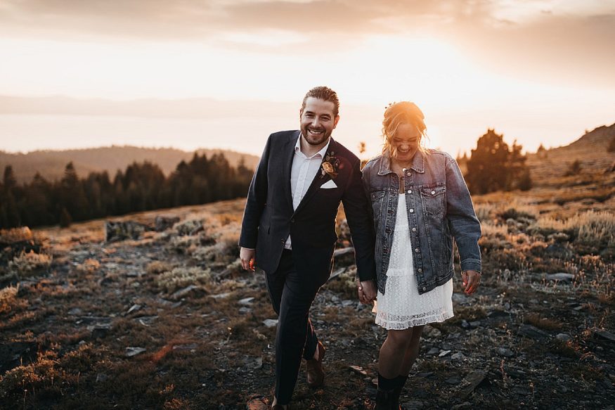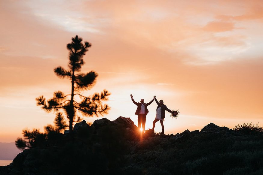 A: Well, Matt and I were originally due to have a family-only, 20-person ceremony in South Lake Tahoe in July 2020. We’d already done quite a bit of planning when COVID happened in March.We hemmed and hawed for a few months about what to do—postpone our wedding weekend to a later date OR say, “screw it,” and elope. While it was exclude family, I’d always secretly found the idea of eloping so romantic. So after giving ourselves the space to grieve the loss of our original plan, we decided to move forward with our lives and elope! That’s when we started to get excited about the new plan.We kept our original photographers, Rob and M of Vild Photography. And it was serendipitous because they specialize in amazing, adventurous elopements in amazing Tahoe locations! In formulating the new plan, Rob and M wanted to know how we wanted to spend our wedding day. Now that we were eloping, the possibilities were really endless. Did we want to hike? Go to the spa? Chill on the beach? It was totally up to us. Matt and I knew that we wanted to hang out with our dog, have some drinks, listen to some music, and watch the sun go down. (This is basically our weekend routine living in SF.) Rob and M took that information and scouted a completely awesome mountaintop location. While it was tricky to get to, we have a Jeep Wrangler, so we could get there! The entire vibe of our day was adventurous, casual, spontaneous, and rustic. I threw on my hiking boots after our ceremony, we popped champagne, and watched the jaw-droppingly beautiful sunset. We got to hang out with our dog. We filled in the details as we went and the evening flowed so organically. We NEVER could’ve enjoyed that moment, in that location, together if family had been there. It all worked out the way it was supposed to.As for our ceremony, we incorporated elements of Matt’s Judaism and my Christian upbringing.