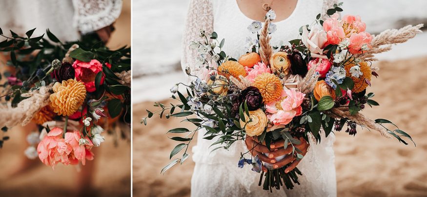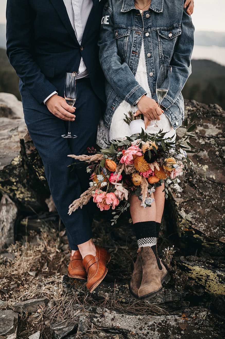 A: After stripping down our ceremony and deciding to elope, I knew one of the only things I still wanted to make me feel like a “bride” was a big, rustic wedding bouquet. My vision for the bouquet was an “undone” look, with pops of color and quintessential elements of California (such as pampas grass.)Andi from Twine & Dandy brought my vision to life beyond my wildest dreams. She curated bright blue delphiniums and red ranunculus, with orange and pink touches and a few dusty elements to soften the palette. She called it my “Tahoe Sunset” bouquet. It was massive and asymmetrical, which lent itself to that wild, “undone” vibe I wanted. Andi also wrapped a piece of my mother’s wedding veil around the stems—a personal touch that meant so much to me (especially without our families physically present). In addition to the bouquet, we did a boutonniere for my husband and a flower hair piece for my updo.This bouquet ended up being such a large part of our pictures and really matched the adventurous, spontaneous vibe of our elopement. I felt so special carrying those flowers around that mountain.