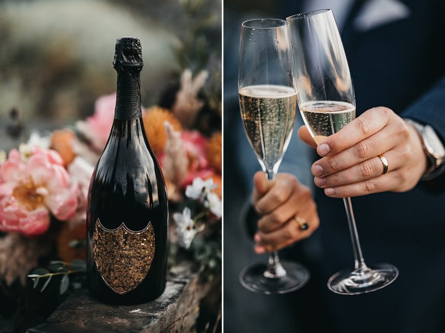 A: Our sunset elopement had a few special touches 🙂 Our dog, Louie, wore a blue bowtie from The Foggy Dog. We brought champagne glasses from my brother and sister-in-law and a bottle of vintage Dom from my parents. We also drank Labatt Blues (a tribute to Matt’s hometown of Buffalo) and Sam Adams beers (a tribute to my Boston stomping ground). We got to give our dog lots of kisses and watch him run around like a maniac  across the mountaintop.The best part of our wedding? Driving down off the mountain in the dark, with the top down on our Jeep, blasting Chris Stapleton’s “Tennessee Whiskey.”