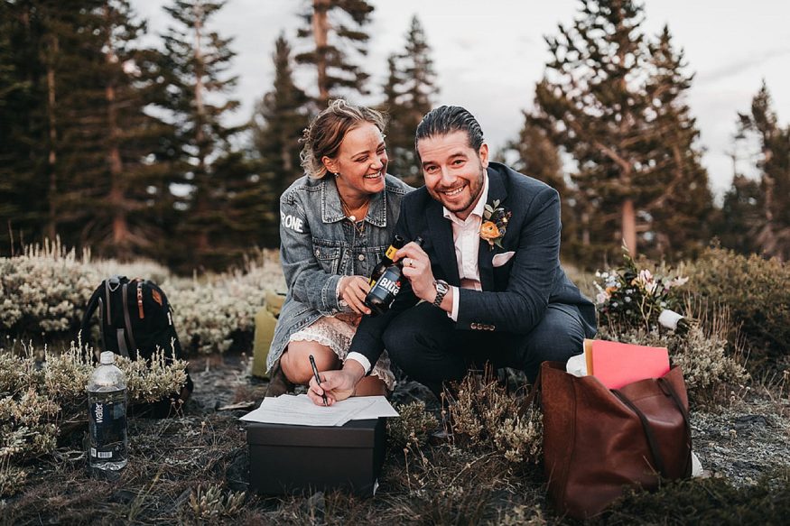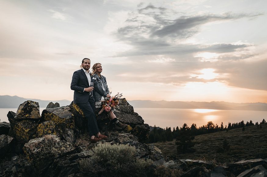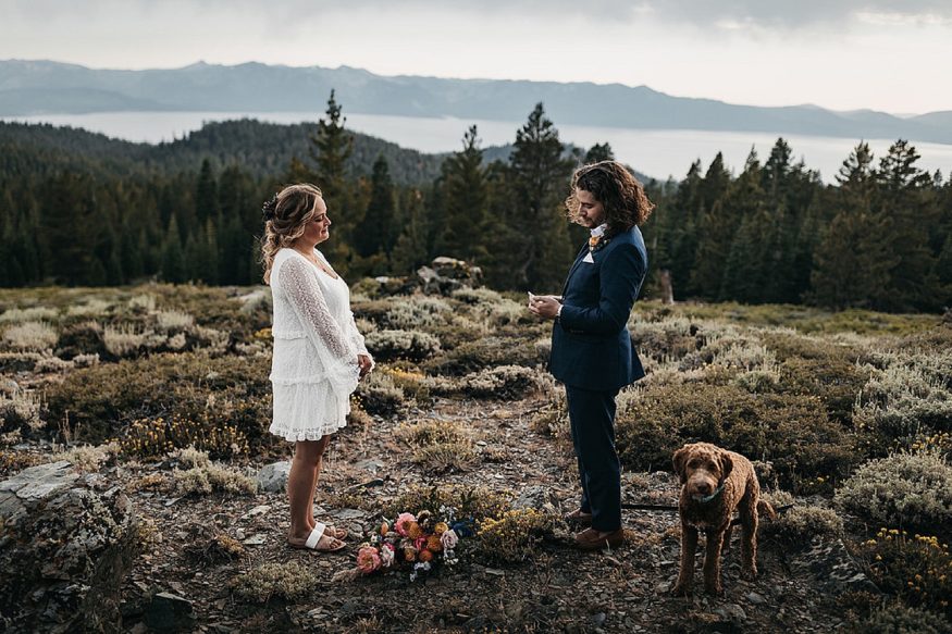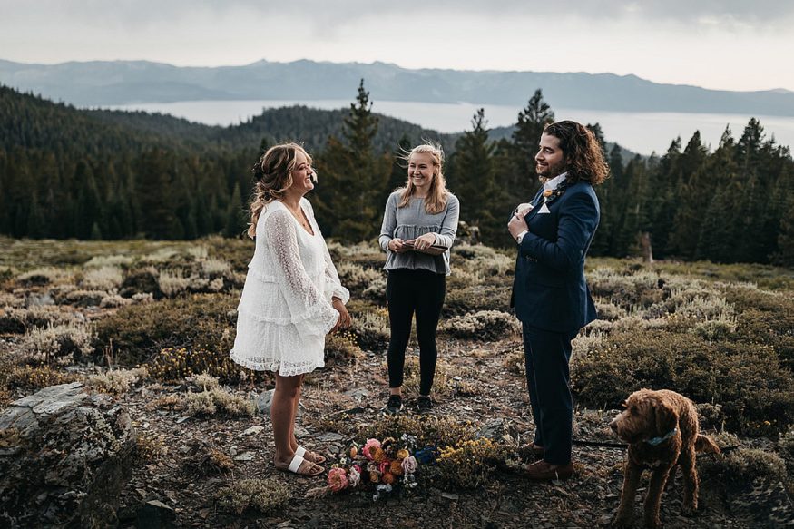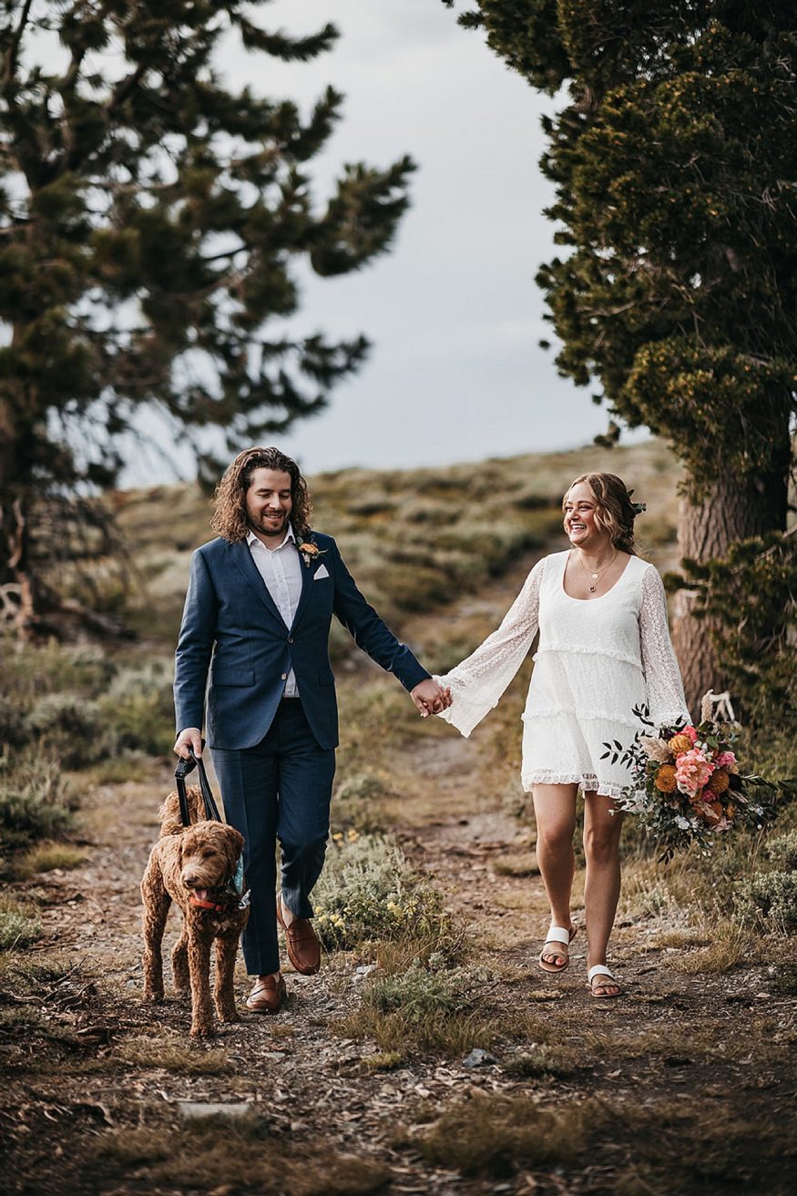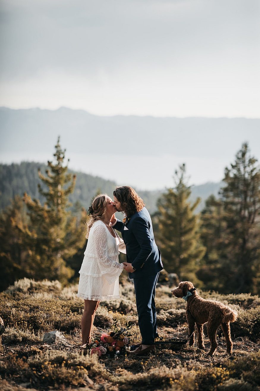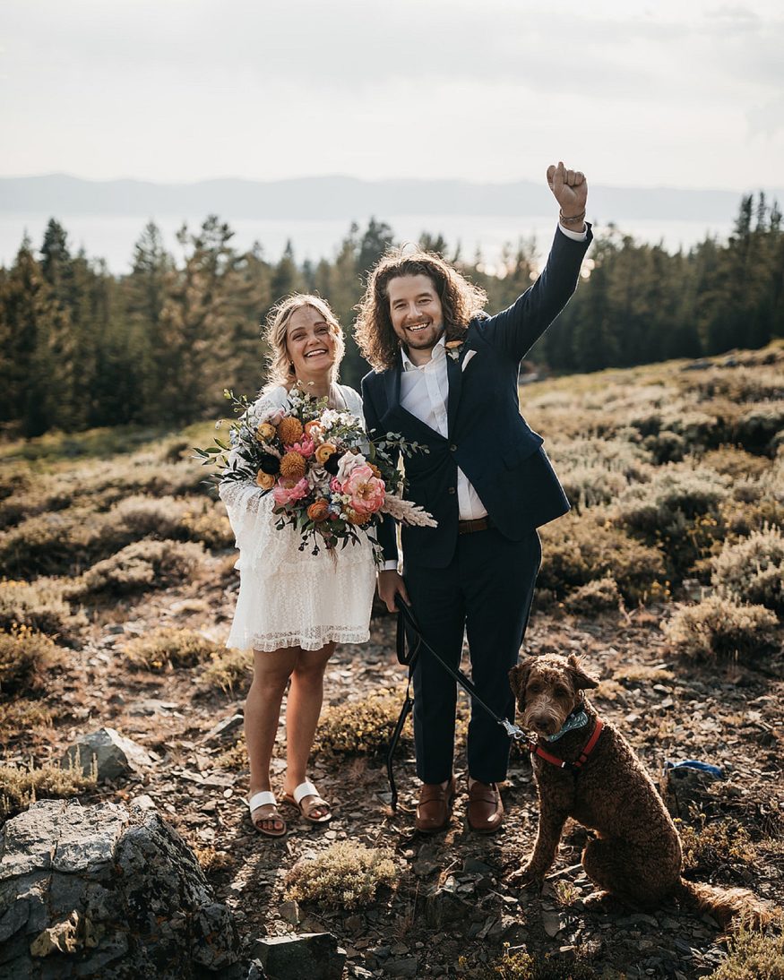 A: Well, Matt and I were originally due to have a family-only, 20-person ceremony in South Lake Tahoe in July 2020. We’d already done quite a bit of planning when COVID happened in March.We hemmed and hawed for a few months about what to do—postpone our wedding weekend to a later date OR say, “screw it,” and elope. While it was exclude family, I’d always secretly found the idea of eloping so romantic. So after giving ourselves the space to grieve the loss of our original plan, we decided to move forward with our lives and elope! That’s when we started to get excited about the new plan.We kept our original photographers, Rob and M of Vild Photography. And it was serendipitous because they specialize in amazing, adventurous elopements in amazing Tahoe locations! In formulating the new plan, Rob and M wanted to know how we wanted to spend our wedding day. Now that we were eloping, the possibilities were really endless. Did we want to hike? Go to the spa? Chill on the beach? It was totally up to us. Matt and I knew that we wanted to hang out with our dog, have some drinks, listen to some music, and watch the sun go down. (This is basically our weekend routine living in SF.) Rob and M took that information and scouted a completely awesome mountaintop location. While it was tricky to get to, we have a Jeep Wrangler, so we could get there! The entire vibe of our day was adventurous, casual, spontaneous, and rustic. I threw on my hiking boots after our ceremony, we popped champagne, and watched the jaw-droppingly beautiful sunset. We got to hang out with our dog. We filled in the details as we went and the evening flowed so organically. We NEVER could’ve enjoyed that moment, in that location, together if family had been there. It all worked out the way it was supposed to.As for our ceremony, we incorporated elements of Matt’s Judaism and my Christian upbringing.