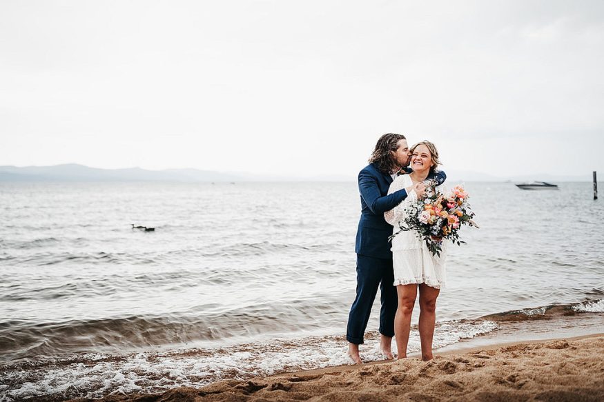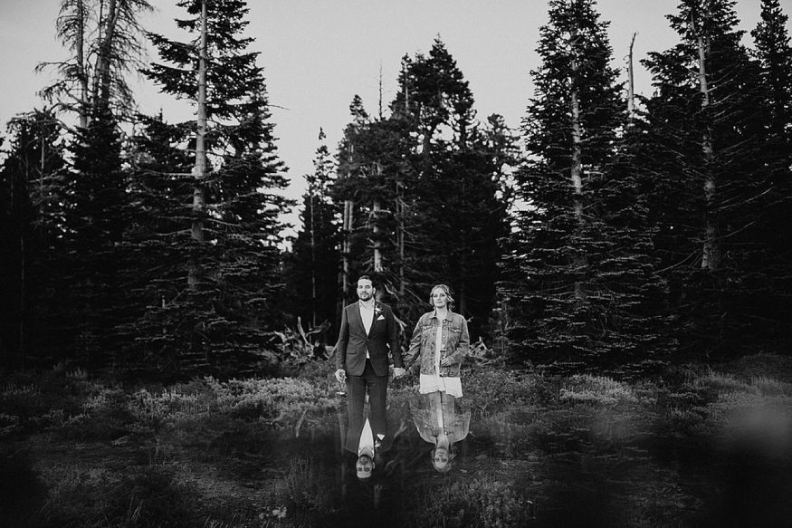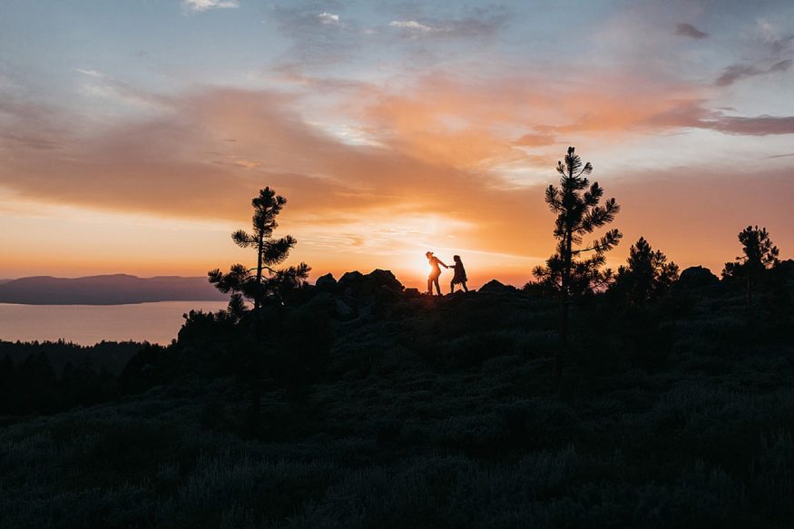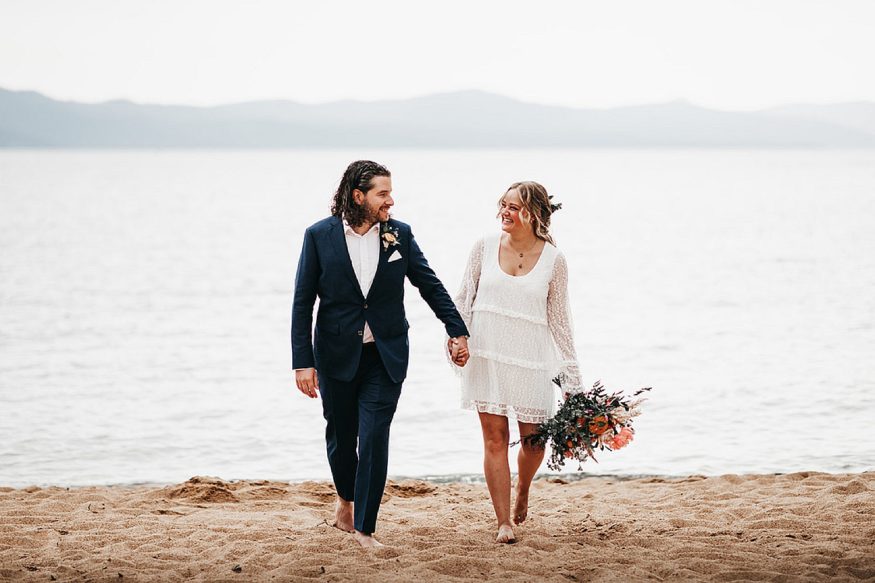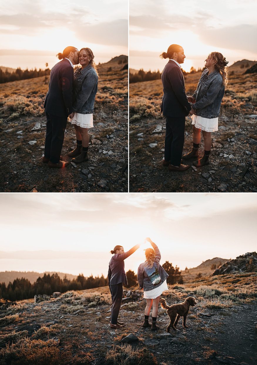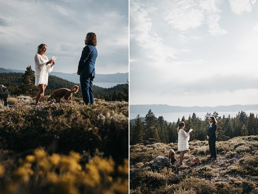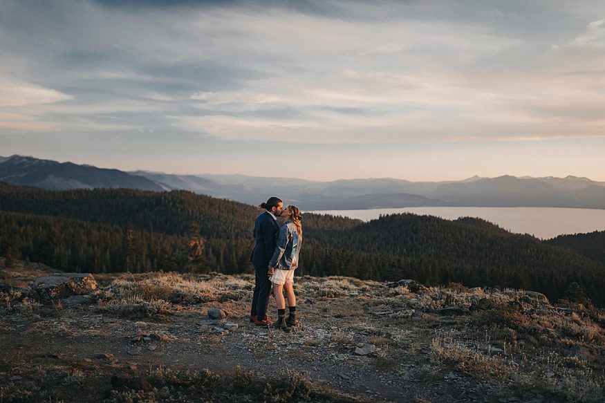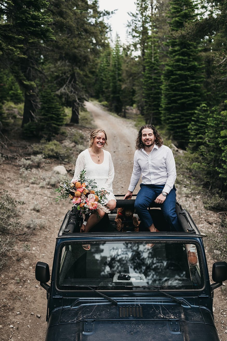 A: Well, Matt and I were originally due to have a family-only, 20-person ceremony in South Lake Tahoe in July 2020. We’d already done quite a bit of planning when COVID happened in March.We hemmed and hawed for a few months about what to do—postpone our wedding weekend to a later date OR say, “screw it,” and elope. While it was exclude family, I’d always secretly found the idea of eloping so romantic. So after giving ourselves the space to grieve the loss of our original plan, we decided to move forward with our lives and elope! That’s when we started to get excited about the new plan.We kept our original photographers, Rob and M of Vild Photography. And it was serendipitous because they specialize in amazing, adventurous elopements in amazing Tahoe locations! In formulating the new plan, Rob and M wanted to know how we wanted to spend our wedding day. Now that we were eloping, the possibilities were really endless. Did we want to hike? Go to the spa? Chill on the beach? It was totally up to us. Matt and I knew that we wanted to hang out with our dog, have some drinks, listen to some music, and watch the sun go down. (This is basically our weekend routine living in SF.) Rob and M took that information and scouted a completely awesome mountaintop location. While it was tricky to get to, we have a Jeep Wrangler, so we could get there! The entire vibe of our day was adventurous, casual, spontaneous, and rustic. I threw on my hiking boots after our ceremony, we popped champagne, and watched the jaw-droppingly beautiful sunset. We got to hang out with our dog. We filled in the details as we went and the evening flowed so organically. We NEVER could’ve enjoyed that moment, in that location, together if family had been there. It all worked out the way it was supposed to.As for our ceremony, we incorporated elements of Matt’s Judaism and my Christian upbringing.