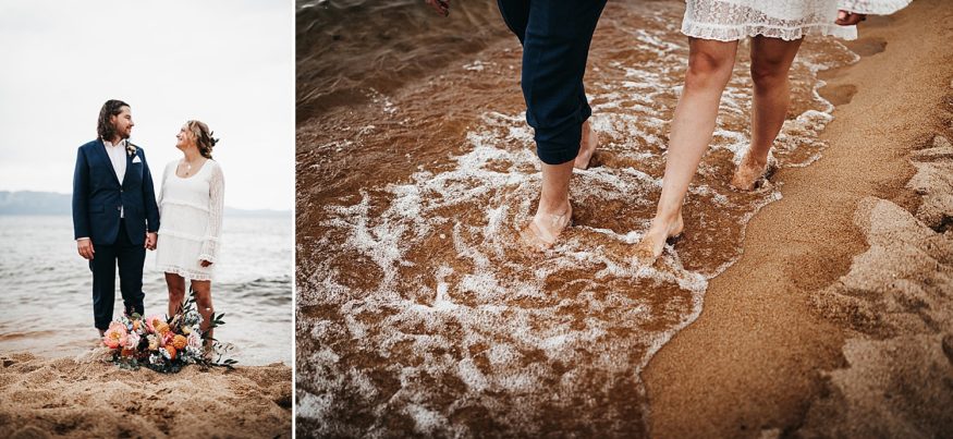 A: Well, I never had a really specific vision for how I wanted to look on my wedding day. Unlike a lot of other women, I had never daydreamed about a particular dress or “fashion moment.” Once Matt and I got engaged and started planning our original ceremony, I thought I might even wear blue instead of white. When COVID happened, I realized that it was going to be really difficult to try on dresses with SF in lockdown and no boutiques open. I eventually talked to a bridal boutique on Zoom and they showed me options, but I had a thought: if we are eloping and I don’t have family there to help me maneuver a traditional wedding dress (AND I want to be comfortable if we’re riding in our Jeep up a mountain), I’m not going to be relaxed in a big, fussy gown. And I knew that the ONE thing I wanted to feel on our wedding day, given our unique elopement circumstances, was to feel PRESENT and relaxed.So I decided to order a few dresses online from Show Me Your Mumu, tried them on in my living room in front of my husband (we’re not super traditional!), and picked a short dress with flowy, lace sleeves. I bought some simple sandals from Soludo’s, some jewelry from Mejuri and Rellery, and had my little cousin paint my jean jacket with a classic Tahoe illustration.  (Her name is Daisy Gulla and she’s an amazing artist.) The Blundstones and high socks were a completely spontaneous, last-minute decision on the day of our wedding, but, again, I knew I wanted to be comfortable. I’m so glad I threw them in my bag because those boots are my signature look and the pictures are that much more “us.”My husband bought a custom suit from Indochino (and did two road trips to Sacramento just to find a showroom that could do measurements during COVID). He opted for a beautiful, deep linen blue that complements his blue eyes.