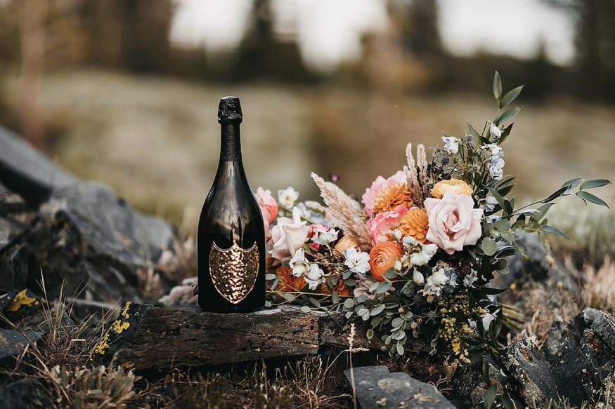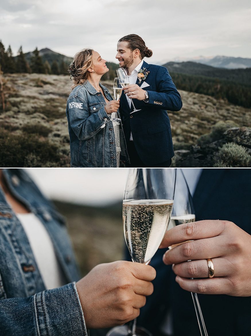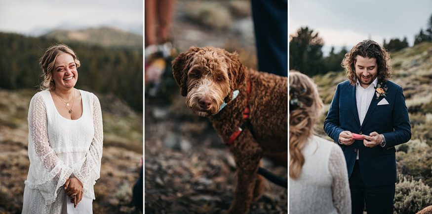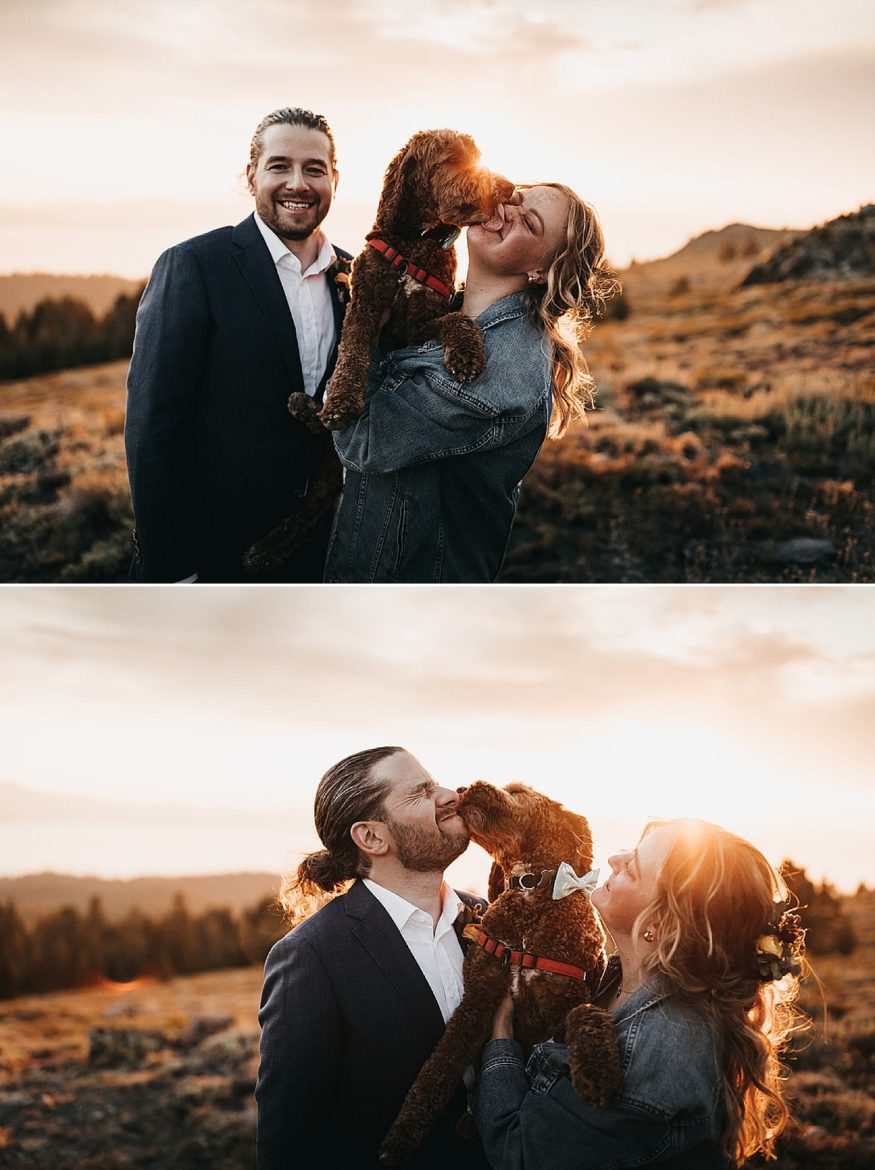 A: Our sunset elopement had a few special touches 🙂 Our dog, Louie, wore a blue bowtie from The Foggy Dog. We brought champagne glasses from my brother and sister-in-law and a bottle of vintage Dom from my parents. We also drank Labatt Blues (a tribute to Matt’s hometown of Buffalo) and Sam Adams beers (a tribute to my Boston stomping ground). We got to give our dog lots of kisses and watch him run around like a maniac  across the mountaintop.The best part of our wedding? Driving down off the mountain in the dark, with the top down on our Jeep, blasting Chris Stapleton’s “Tennessee Whiskey.”