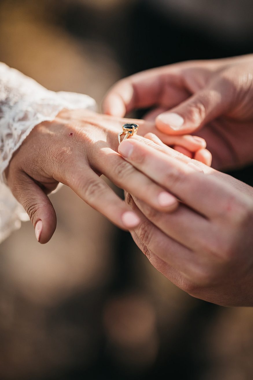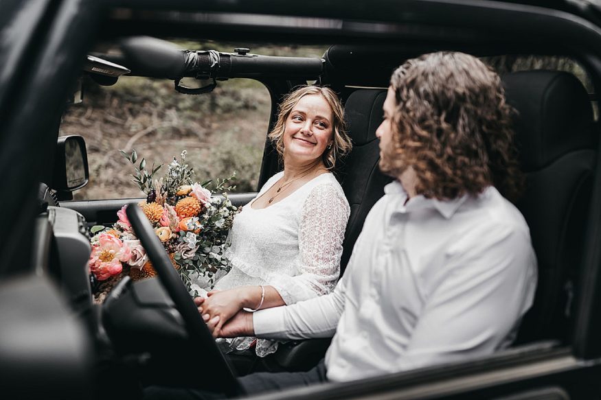 A: It’s hard to pinpoint a specific moment from our sunset elopement because the entire evening was such an adventure. We literally off-roaded in our Jeep Wrangler to the top of a mountain, which was a blast in and of itself. (Matt couldn’t stop saying, “I can’t believe I’m off-roading to my wedding!”)However, I think the most special moment of the elopement was getting to the top and seeing the views—and then having that space all to ourselves. We were so immersed in the natural beauty of the location that it took our breath away. It was a bit overcast at the start of our ceremony, but as Matt started reading his vows, the sun emerged from behind the clouds and beamed directly down onto us. As we drank champagne and the sun started to go down, we were basically just continually gasping at how beautiful the sky looked.Marrying Matt was the best day of my life, but to do it in such a unique way—in SUCH a beautiful location—was by far the coolest part.
