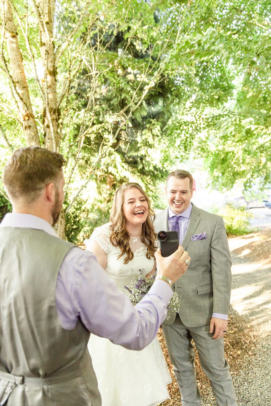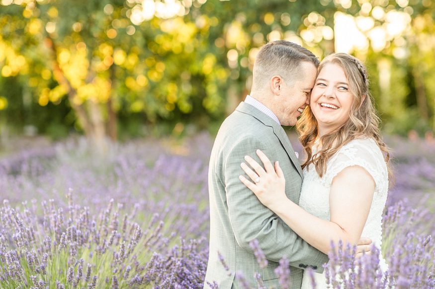 A: We were originally planning for a medium size wedding in September (September 19th). We had invitations printed but had not sent them out yet when COVID hit. We, along with a lot of other couples got stuck with the dilemma of what to do. We waited until May when Washington State was supposed to get to stage 3 of a 5 stage reopening plan and our Governor ended up extending our stage 1 time. We had a really hard week of discussions about whether we wanted to continue to play the wait and see game, or if we wanted to make the decision to postpone.That week we decided to postpone, mostly due to (Kyna) having out of state family that would not have been able to travel even if Washington State had been in a better phase by September. When we made the decision to postpone though, we knew we still wanted to be legally married this year.I (Kyna) have severe arthritis in one hip and need to have a hip replacement done. We are both very outdoorsy and love to hike and my arthritis is starting to hinder my ability to participate in the activity that brought us together (more about that later). We already had a timeframe for surgery in mind and I also need surgery before we can start having kids. While we know that COVID is a big deal and is breaking some families apart, we felt it was important for us to bring our families together through us still getting married this year!I have been friends with the Woodinville Lavender owners son and daughter in law since high school. So I’ve attended over a dozen weddings, baby showers and church events at the Lavender Farm over the years. I had always dreamed of getting married there. Purple is my favorite color and I LOVE the smell of lavender, it’s so calming and comforting. The Lavender Farm normally books out weddings several years in advance for the summer season. It’s not a venue that you can normally get in to if you want to host a wedding with only a couple months advance notice. BUT, because we were just looking to have our immediate families in attendance, we knew we could pull off a mid-week ceremony. I contacted Tom and we were able to find a date that would work for our family’s, photographer and the Lavender Farm. I would get the Lavender wedding of my dreams after all! Because Lavender only blooms in the summer, and with the option to host our mini ceremony at the Lavender Farm, we actually pulled up our wedding date from September to July 28th. After we settled on the Lavender Farm for our minimony ceremony, lavender definitely became the theme/style and color palette. For our brunch reception our theme and color palette was white and gold. We did a reverse wedding day and decided because COVID is making the world unpredictable, we should eat the cake first! Kidding (Kind-of)! Due to logistics of the Lavender Farm and the timeline for golden hour photos, we actually decided to host a brunch reception at Sean’s parents’ house that morning (complete with cake cutting) and then we had an evening ceremony at the lavender farm.