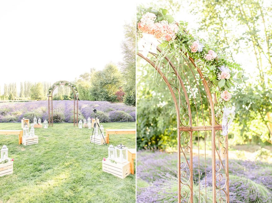 A: We used baby’s breath for the reception centerpieces. We also hung a 6 ft. garland with some carnations and roses across the arch. The bridal bouquet and bridesmaid bouquet was lavender and baby’s breath. Obviously lavender played a huge role in our theme given we got married at a lavender farm. I didn’t want to overdue anything with additional flowers, my goal with the flowers was just to add a bit of a contrast color that wouldn’t distract.