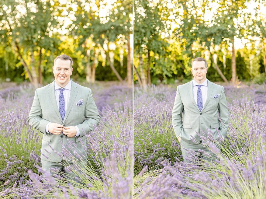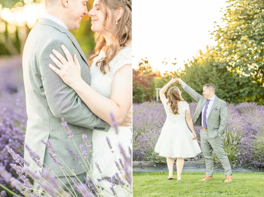 A: When I went wedding dress shopping originally, I had fallen in love with two dresses. One was tea length and one was full length. My MOH and Mom had told me that the tea length dress was super cute, but didn’t feel as mature as the full length dress. I ended up getting the full length dress. When we started planning our minimony, I was originally planning to just wear a simple knee length white dress I had found at a department store. Then I was randomly looking at David’s Bridal on their sale site one day and saw the tea length dress I had fallen in love with originally, in my size as a sample sale dress. I knew the tea length would look fantastic with the lavender field and it was 70% off full retail. Because my dress had an illusion neckline and had beading all the way down, I didn’t go overboard with accessories. I chose some silver flat sandals with silver beading and pearls on the top also from David’s Bridal. I found some simple pearl earrings and a simple pearl bracelet for accessories. I had a blusher veil with me, but ended up LOVING my hairstyle so much on it’s own that I didn’t wear the veil.Sean LOVES prints and pattern, I didn’t want him to feel too traditional or basic. I was also concerned that he was going to get super hot. We went to Men’s Wearhouse and found a light gray suit and paired it with lavender checked dress shirt. He then had fun with his patterns by finding a gorgeous purple paisley tie and a purple print pocket square. He finished off his look with some light brown leather shoes.