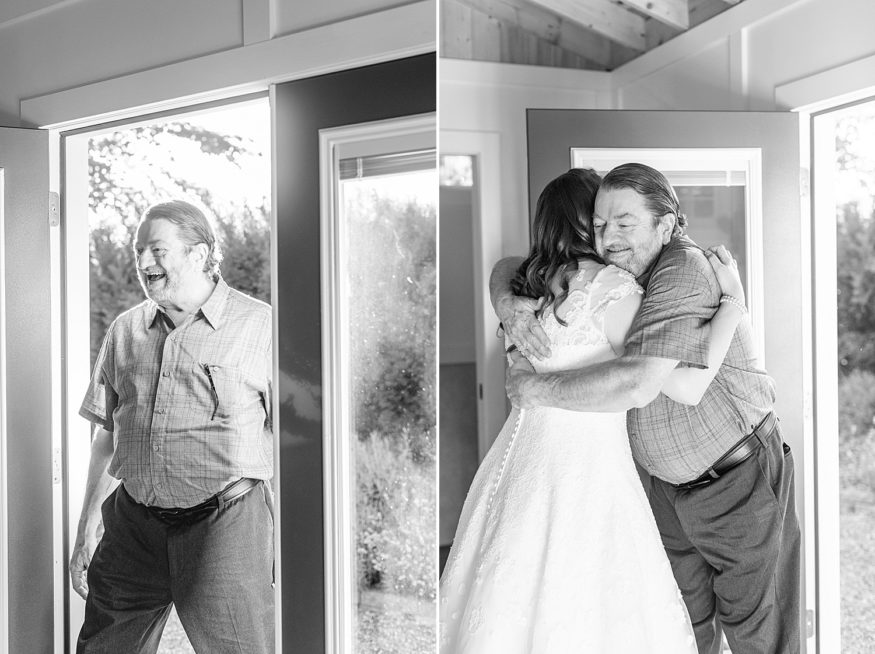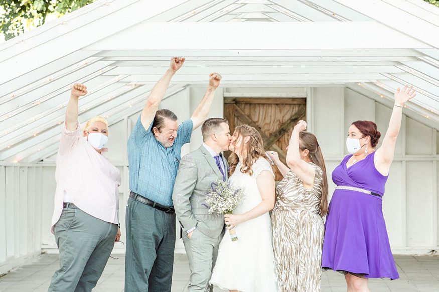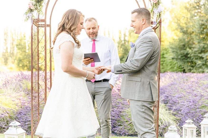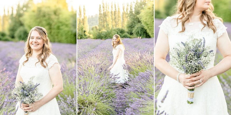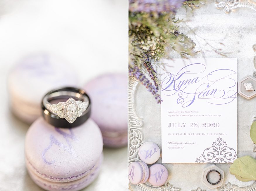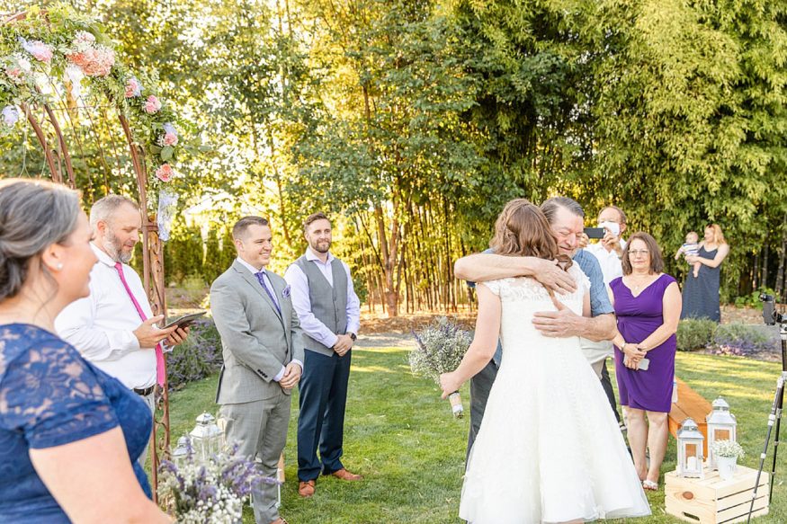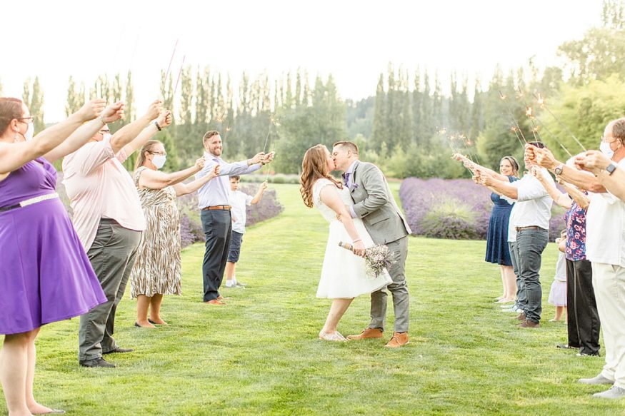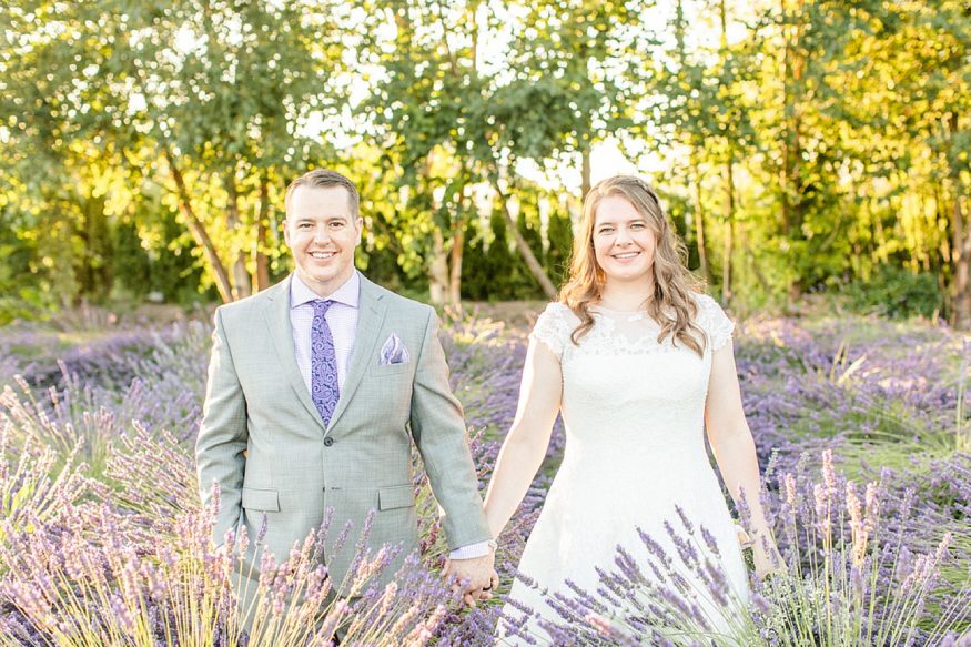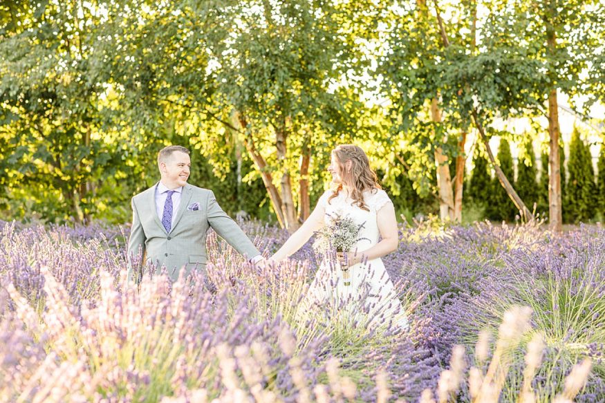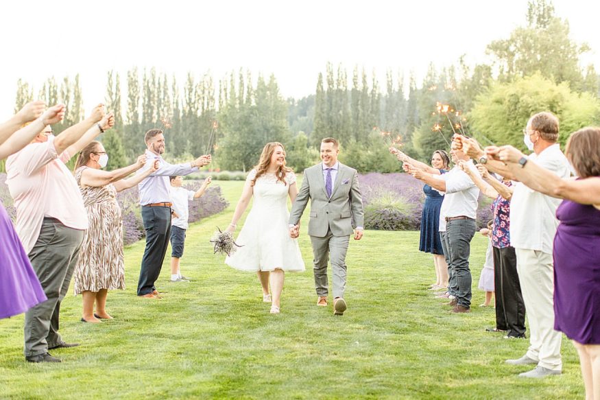 A: We were originally planning for a medium size wedding in September (September 19th). We had invitations printed but had not sent them out yet when COVID hit. We, along with a lot of other couples got stuck with the dilemma of what to do. We waited until May when Washington State was supposed to get to stage 3 of a 5 stage reopening plan and our Governor ended up extending our stage 1 time. We had a really hard week of discussions about whether we wanted to continue to play the wait and see game, or if we wanted to make the decision to postpone.That week we decided to postpone, mostly due to (Kyna) having out of state family that would not have been able to travel even if Washington State had been in a better phase by September. When we made the decision to postpone though, we knew we still wanted to be legally married this year.I (Kyna) have severe arthritis in one hip and need to have a hip replacement done. We are both very outdoorsy and love to hike and my arthritis is starting to hinder my ability to participate in the activity that brought us together (more about that later). We already had a timeframe for surgery in mind and I also need surgery before we can start having kids. While we know that COVID is a big deal and is breaking some families apart, we felt it was important for us to bring our families together through us still getting married this year!I have been friends with the Woodinville Lavender owners son and daughter in law since high school. So I’ve attended over a dozen weddings, baby showers and church events at the Lavender Farm over the years. I had always dreamed of getting married there. Purple is my favorite color and I LOVE the smell of lavender, it’s so calming and comforting. The Lavender Farm normally books out weddings several years in advance for the summer season. It’s not a venue that you can normally get in to if you want to host a wedding with only a couple months advance notice. BUT, because we were just looking to have our immediate families in attendance, we knew we could pull off a mid-week ceremony. I contacted Tom and we were able to find a date that would work for our family’s, photographer and the Lavender Farm. I would get the Lavender wedding of my dreams after all! Because Lavender only blooms in the summer, and with the option to host our mini ceremony at the Lavender Farm, we actually pulled up our wedding date from September to July 28th. After we settled on the Lavender Farm for our minimony ceremony, lavender definitely became the theme/style and color palette. For our brunch reception our theme and color palette was white and gold. We did a reverse wedding day and decided because COVID is making the world unpredictable, we should eat the cake first! Kidding (Kind-of)! Due to logistics of the Lavender Farm and the timeline for golden hour photos, we actually decided to host a brunch reception at Sean’s parents’ house that morning (complete with cake cutting) and then we had an evening ceremony at the lavender farm.