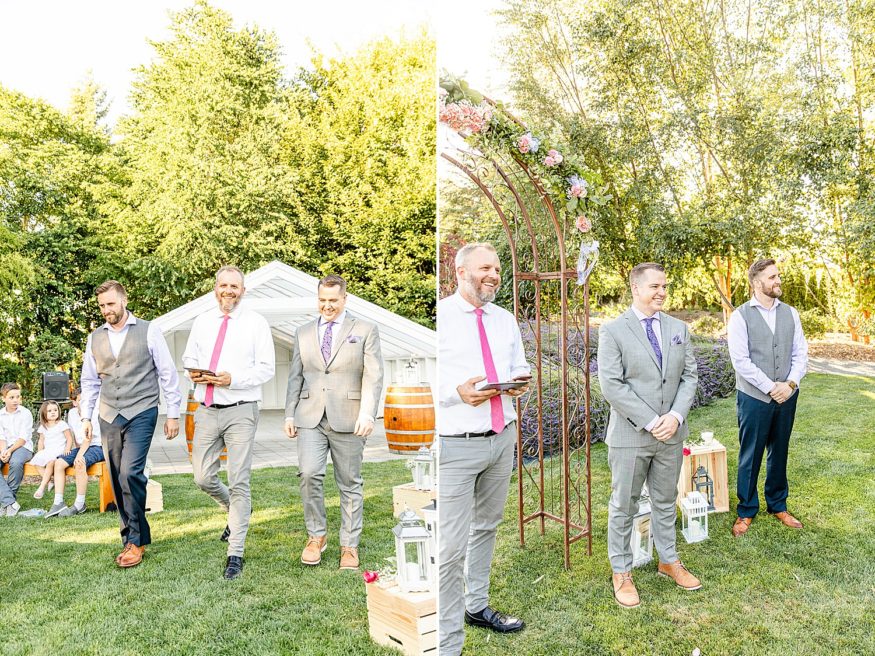 A: We only had the Lavender Farm for 2.5 hours, which included 30 minutes for setup and then the ceremony was scheduled to start. Because of the quick turnaround from when we got on-site to when the ceremony was starting, we decided not to do a first look. Kyna had not told Sean anything about her dress, or hair & makeup style for the day. So the first time we got to see each other was when I was walking down the aisle. It was such a special moment for both of us to see each other for the first time! Kyna definitely shed some tears when she saw Sean at the end of the aisle. Even though we had seen each other during brunch, we were so wrapped up in hosting everyone and trying to talk with our guests, we didn’t really spend much time together. So when I (Kyna) came down the aisle it was really our first intimate moment of the day where everything slowed down and we could just focus on each other. It was that moment that COVID didn’t matter, family drama didn’t matter, perfection and expectations didn’t matter. All that mattered were that we were together and still able to celebrate the start of our new lives together!