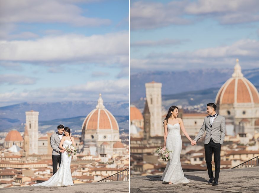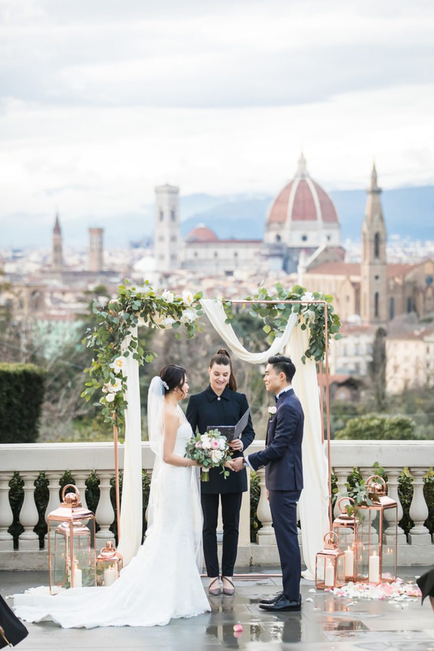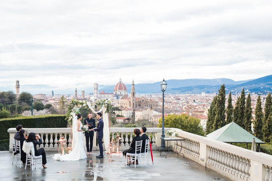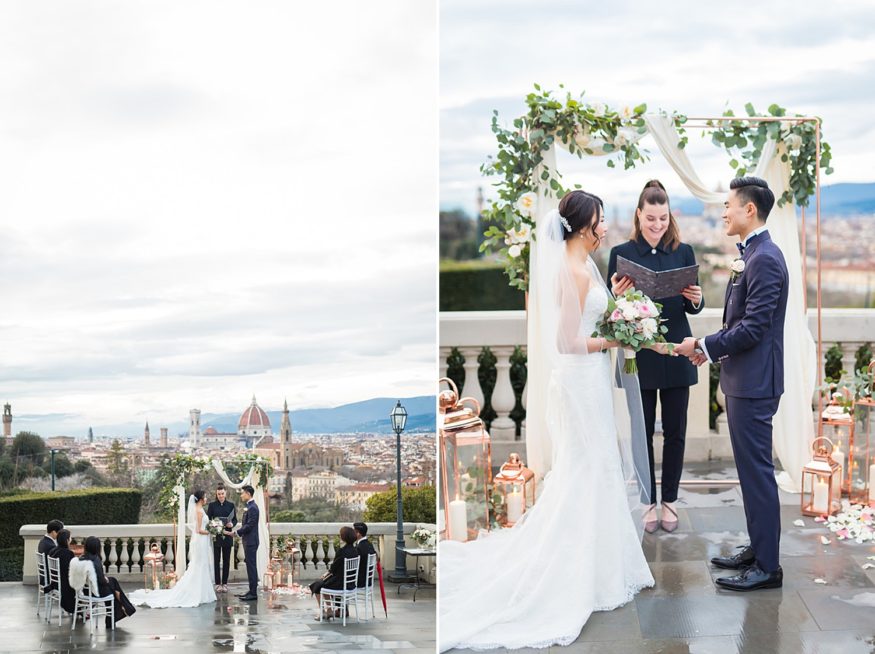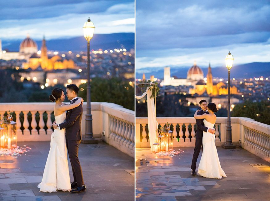 We both love traveling and always wanted to get married in a beautiful setting. It was both of our forever dreams to have an outdoor wedding and our venue being top of the hill overlooking Florence was just perfect. Although our wedding day started off rainy, it miraculously cleared up just in time allowing us to be married outside at sunset. It was magical!