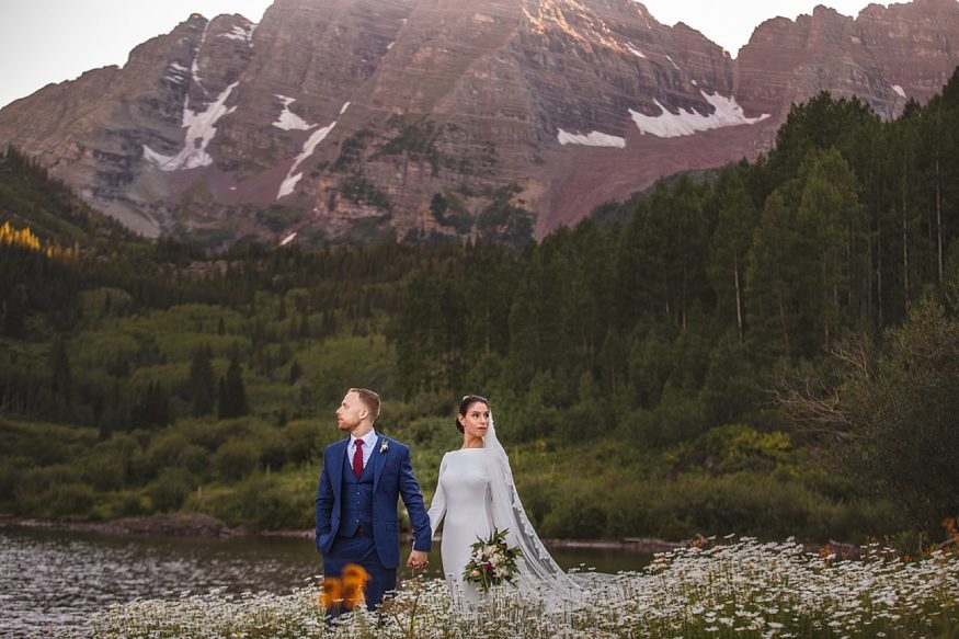 A: Yes, the location as mentioned prior was very personal to us. We also wrote our own vows, and the song I walked down to him was personal and special. For our original wedding, I was going to have our families walk to Pachelbel’s Canon in D, which Jewish brides usually walk down to. So, instead I walked down to that song and next year our family will walk down to that song for the church ceremony. My father passed away, before I met Seth. When he passed we had pieces of his favorite suit that he was buried in taken to keep and hold onto. I had the seamstress take the piece I had saved and make a heart out of it and sew it into the skirt of my gown. For me the favorite part of the wedding was the look on Seth’s face as I walked toward him. It was such a magical moment. I was so excited for him to finally see me in my wedding dress and veil! Other parts were getting to FaceTime friends and family before we got married and having my sister be able to watch me get my hair and makeup done. Seth also surprised me with Tiffany Pearl earrings to wear for the day.We saw our first Moose!!! We have been hiking and visiting national parks for almost three years and had always wanted to see a moose and never have. On our wedding day we saw a Moose in Maroon Bells, and took that as a sign.