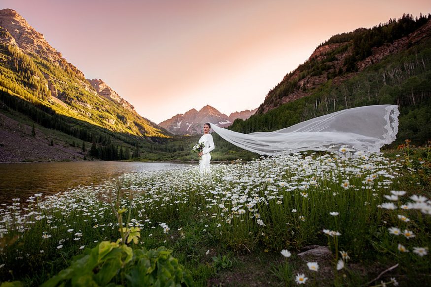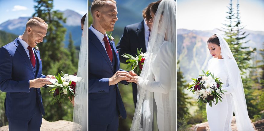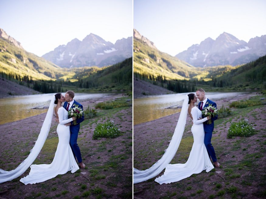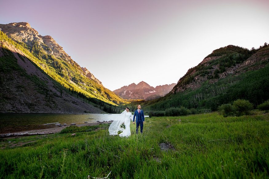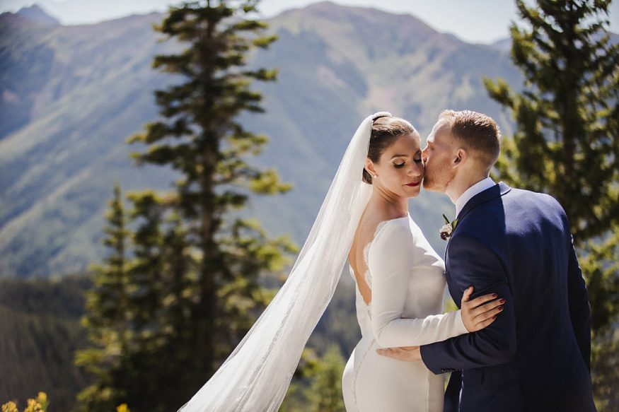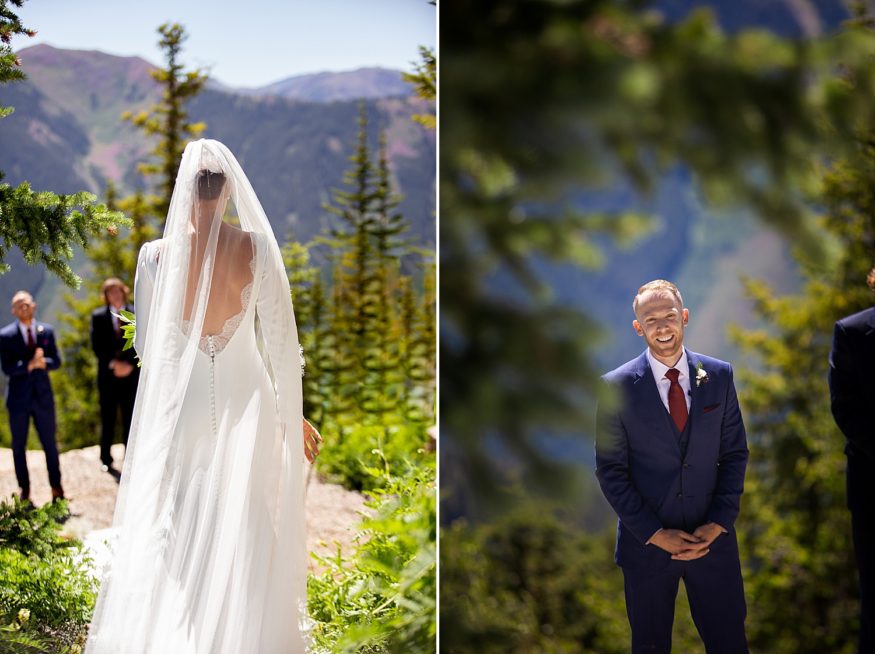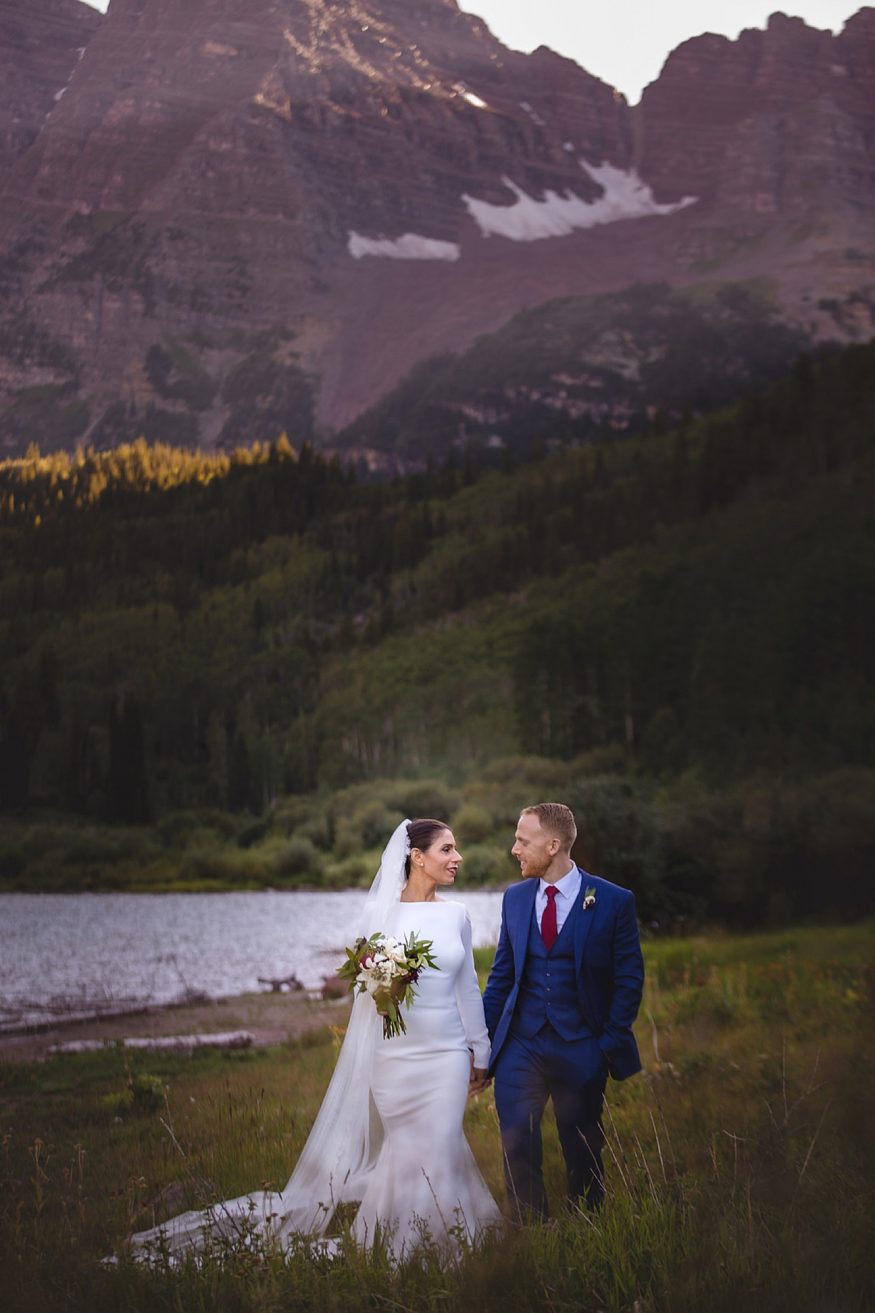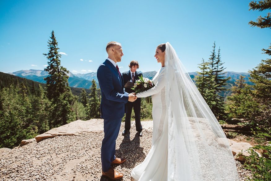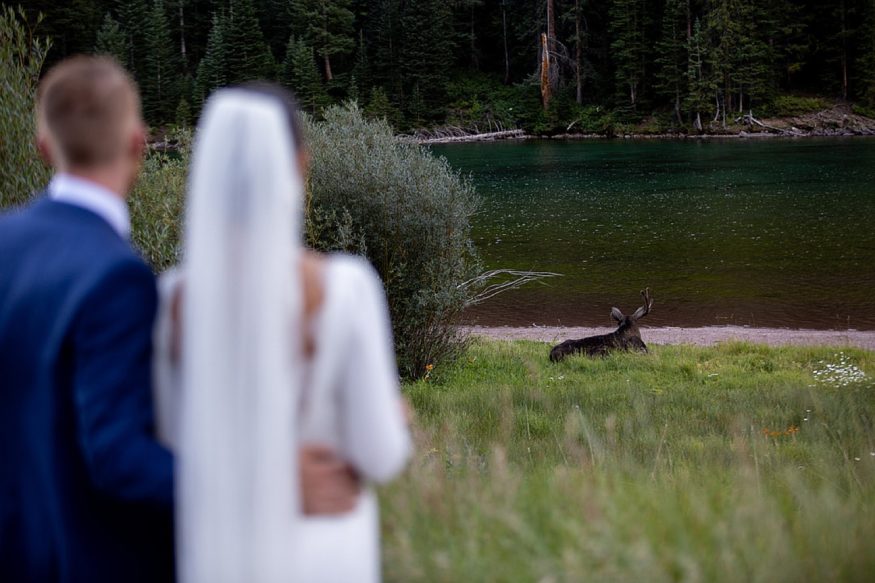 A: Yes, the location as mentioned prior was very personal to us. We also wrote our own vows, and the song I walked down to him was personal and special. For our original wedding, I was going to have our families walk to Pachelbel’s Canon in D, which Jewish brides usually walk down to. So, instead I walked down to that song and next year our family will walk down to that song for the church ceremony. My father passed away, before I met Seth. When he passed we had pieces of his favorite suit that he was buried in taken to keep and hold onto. I had the seamstress take the piece I had saved and make a heart out of it and sew it into the skirt of my gown. For me the favorite part of the wedding was the look on Seth’s face as I walked toward him. It was such a magical moment. I was so excited for him to finally see me in my wedding dress and veil! Other parts were getting to FaceTime friends and family before we got married and having my sister be able to watch me get my hair and makeup done. Seth also surprised me with Tiffany Pearl earrings to wear for the day.We saw our first Moose!!! We have been hiking and visiting national parks for almost three years and had always wanted to see a moose and never have. On our wedding day we saw a Moose in Maroon Bells, and took that as a sign.