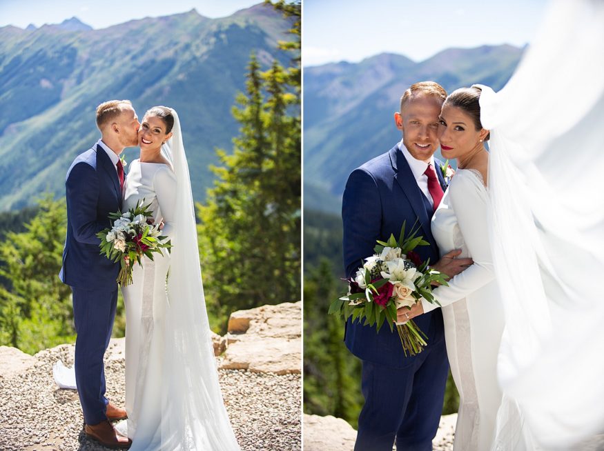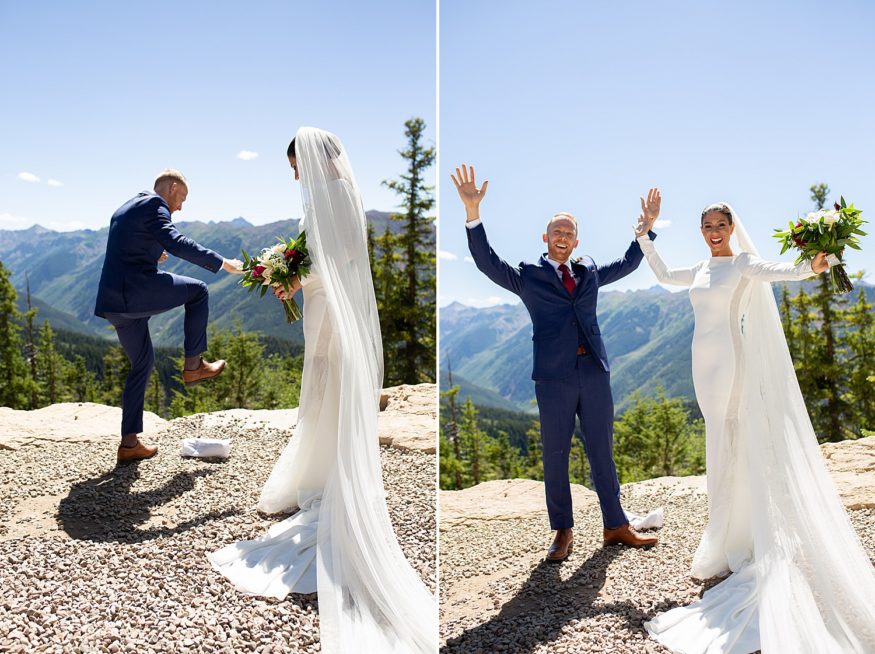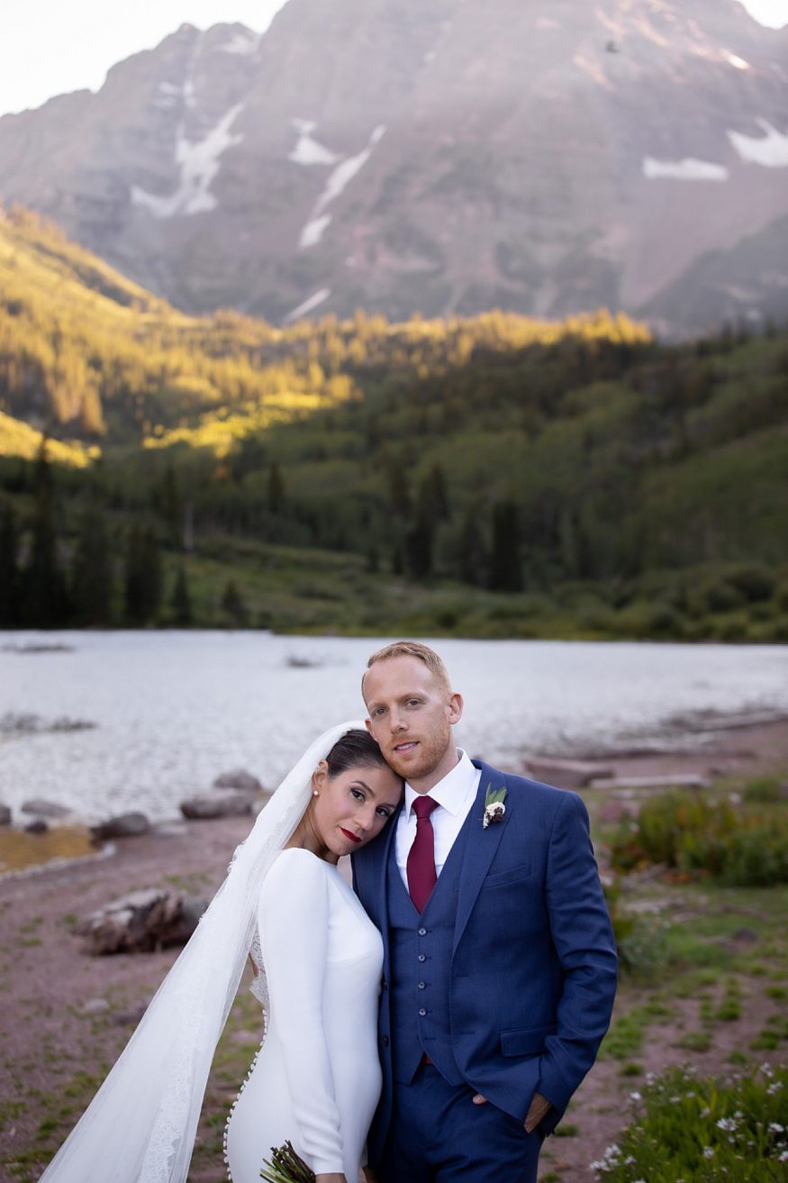 A: Our day was not at all what we had planned. We were supposed to get married August 22, 2020 in Sonoma, CA. Unfortunately, 4 weeks before our wedding the venue and church had to cancel our nuptuals due to government rollbacks. This decision was difficult on many levels, but mostly because we needed to start a family. I’m considered a high-risk pregnancy and we just couldn’t wait to have a baby. I had joked when we first started wedding planning that we should go get married on top of a mountain. After we got the news, Seth suggested we get married on top of that mountain; I had talked about when we first got engaged. We decided that Colorado would be a beautiful location and place that had a lot of significance to us, since we met on a plane ride to Denver. On my first visit to Colorado, to visit Seth he brought me to Aspen and our first hike was of Maroon Bells. And so, it was decided, we were headed back to Colorado and to Aspen Mountain and Maroon Bells to elope! We did not have a specific theme, we were going for but I wanted it to be romantic and still feel elegant for him and I among the mountains and trees. I wanted our love to compliment the breathtaking backdrop of Aspen. The colors we chose were a dark burgundy for his suit’s accent pieces, i.e. tie and pocket square, my lipstick, nails, and some flowers. We also had Seth wear an Indigo blue suit. One of the original colors for CA. wedding. and I had some blue accents in my bouquet. Seth is Jewish and we really wanted to include something traditional, so he stomped on the glass after we were married and saved a piece to take home!
