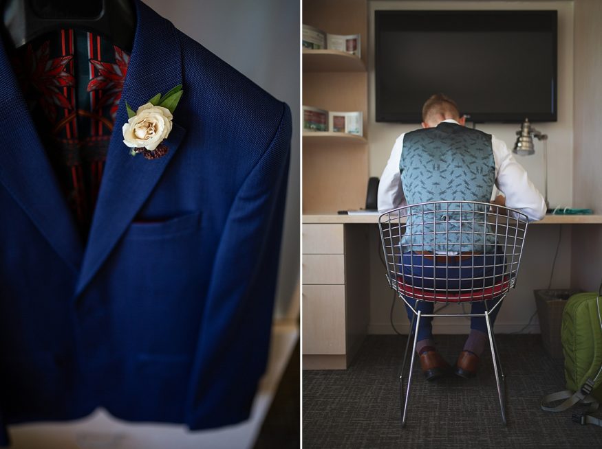 Seth for the Sonoma wedding was going to wear a full tuxedo, since we were having a formal/black-tie wedding. Since we thought that a tuxedo would seem out of place with our elopement location we chose to go with a blue suit, which was Seth’s second choice if he didn’t wear a tuxedo. So we went on the hunt for a blue suit. We only had about ten days to plan our elopement so we went suit shopping as many days as we could. I think he bought three or for suits in varying blue and we had settled on a Charles Tyrwhitt suit. Since he wasn’t doing suspenders with a tux, he wanted a three piece with a vest. We were told his vest was not in store and would be shipped in the next few days. On the Saturday before we left the vest was still not in. We decide to go to Ted Baker in NY and see if there was a vest that could be paired with his suit or a cool textured vest to add to his look. While we were there, we found a full indigo blue three piece suit that he loved. It was slim fit like he was looking for and the stitching details were on point. He had also just purchased about four pairs of shoes for the elopement and one of the pairs was Ted Baker that complimented the look he was going for with an English tan to them. From there we set out to find his burgundy tie and pocket square and matching belt. Since the pants needed to be hemmed, he brought them in on Monday, got them back to Tuesday just in time for us to fly out on Wednesday! Phew!
