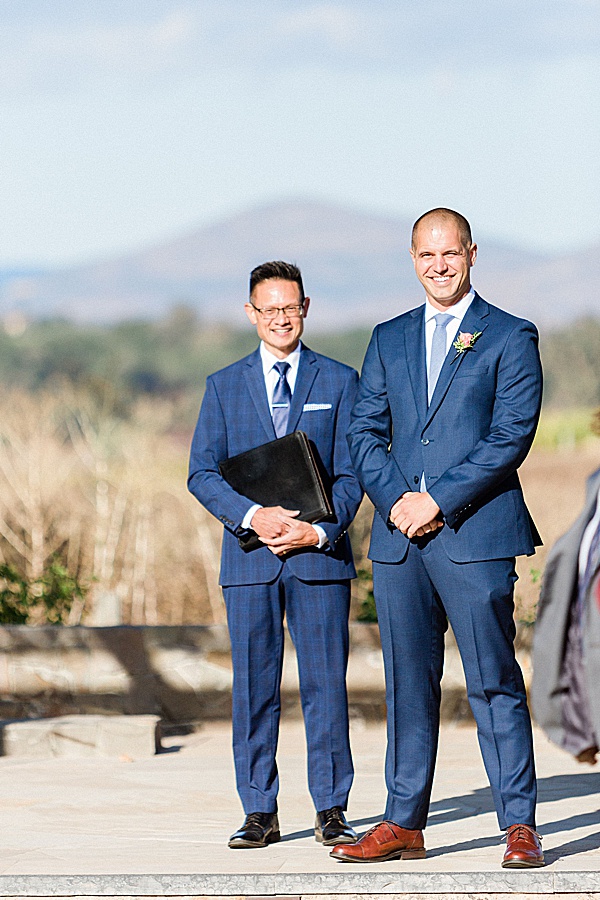 A: Fortunately I have an amazing friend Michelle who actually designs wedding invites so I started there. I knew I wanted navy blues, golds and greenery incorporated. The space at Carneros really didn’t need much as it is absolutely gorgeous. We went minimalist/modern and really relied on the scenery for the rest.