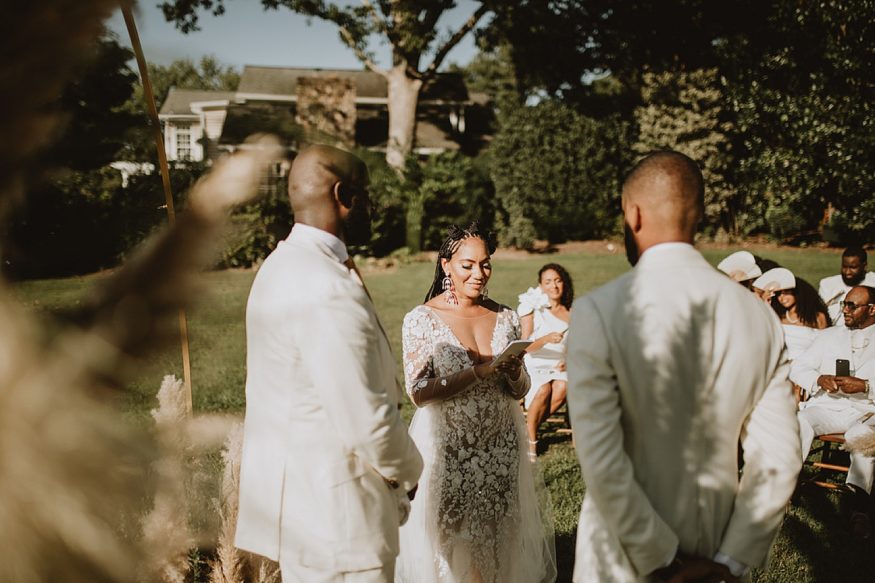 A: my husband and i are both obsessed with nature. we knew that we wanted to have an outdoor ceremony and his mother’s home had the perfect backdrop that only nature could create.  we asked that  all of our guests wear all white/ivory along with the bride and groom.  my dad sang me down the  aisle as i walked barefoot to meet my husband. our good friend was our officiant. our french bulldog,  Archey, stood at the alter with us and snorted during the entire ceremony, adding to nature’s music.   and before walking off as husband and wife, we jumped a lavender infused broom.