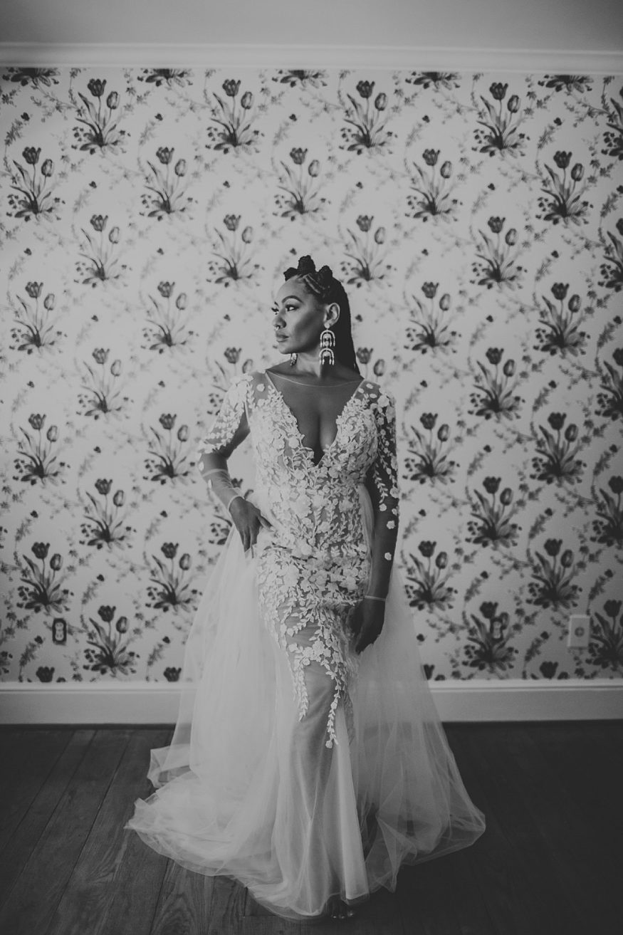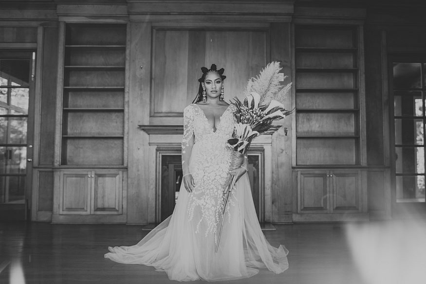 A: I used minimal florals for the wedding decor/aesthetic. I made my bouquet the morning of the wedding, using some  of the same pampas grass and flowers that was foraged from the area, including dead pine needles and a set of mushrooms that i’d been admiring for months . I even added a quartz crystal in between the mushrooms in my bouquet. the florals used in my bouquet were calla lilies and cream hypericum.  my girlfriend, Kori Fields, led the build-out of our arch with the help of my tribe.   for our center pieces, we used calla lilies and snapdragons along with some greenery that we foraged.   we gathered a ton of pampas grass and greenery in my neighborhood that we used for the arch and centerpieces as well.