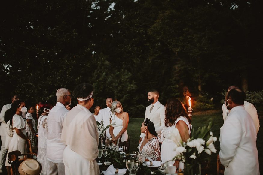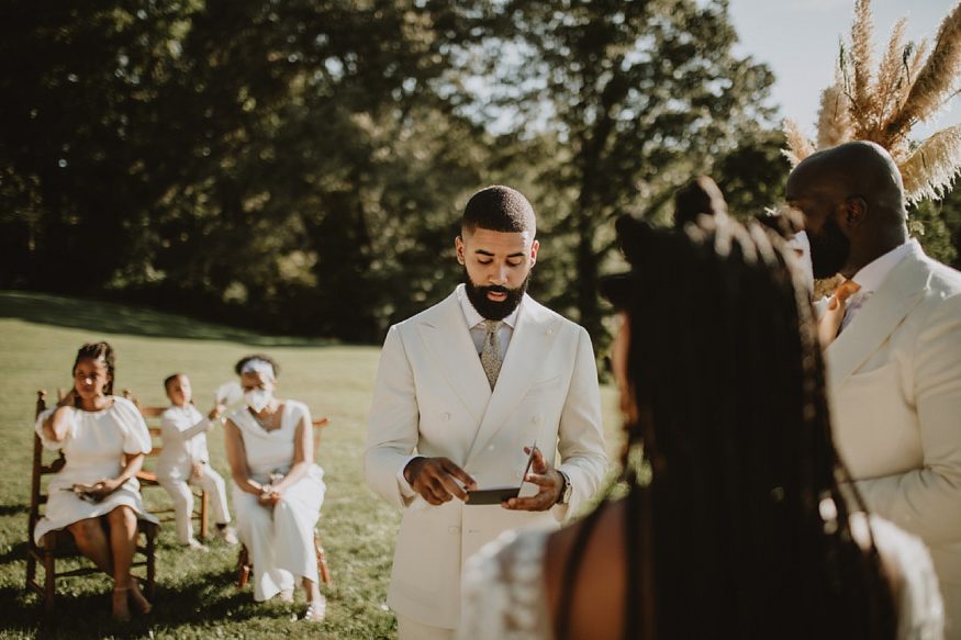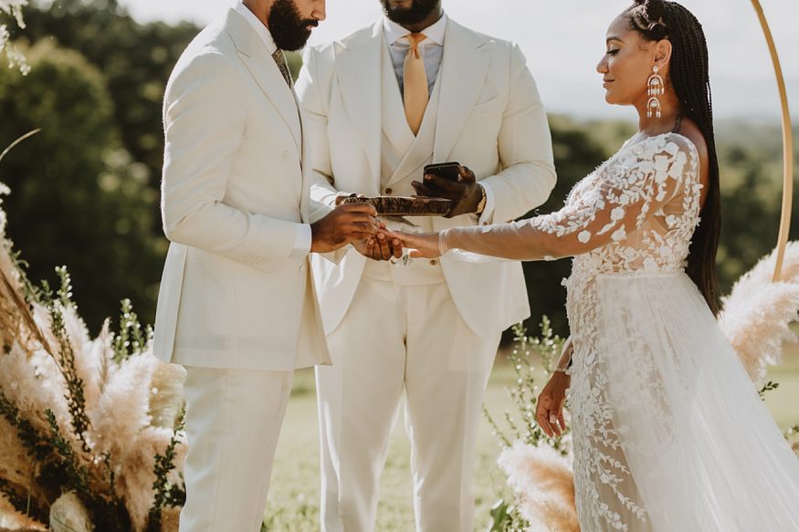A: my husband and i are both obsessed with nature. we knew that we wanted to have an outdoor ceremony and his mother’s home had the perfect backdrop that only nature could create.  we asked that  all of our guests wear all white/ivory along with the bride and groom.  my dad sang me down the  aisle as i walked barefoot to meet my husband. our good friend was our officiant. our french bulldog,  Archey, stood at the alter with us and snorted during the entire ceremony, adding to nature’s music.   and before walking off as husband and wife, we jumped a lavender infused broom.