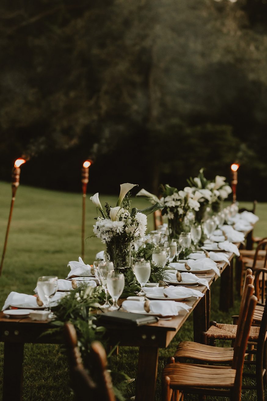 A: Most of our wedding decor was DIY!  My husband and I went scouting for pampas grass about a week prior to the wedding, as i knew that I wanted this to be the star of our decor. the day before the wedding, we went foraging in the area for most of our decor and we purchased the white florals from a shop nearby.  East west vintage rentals provided our tables, mismatch chairs and the velvet green couch.  we used cocculus as a simple table runner with 3 centerpieces that my tribe created.  After dinner, the grass served as our dance floor as we partied the night away under the stars.