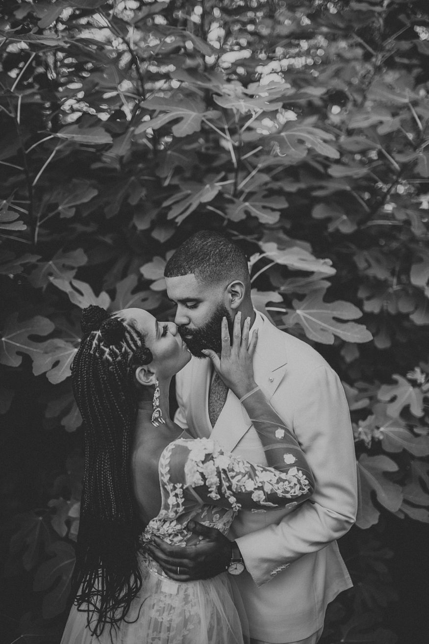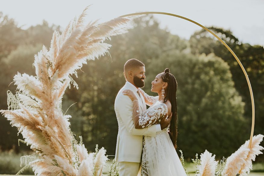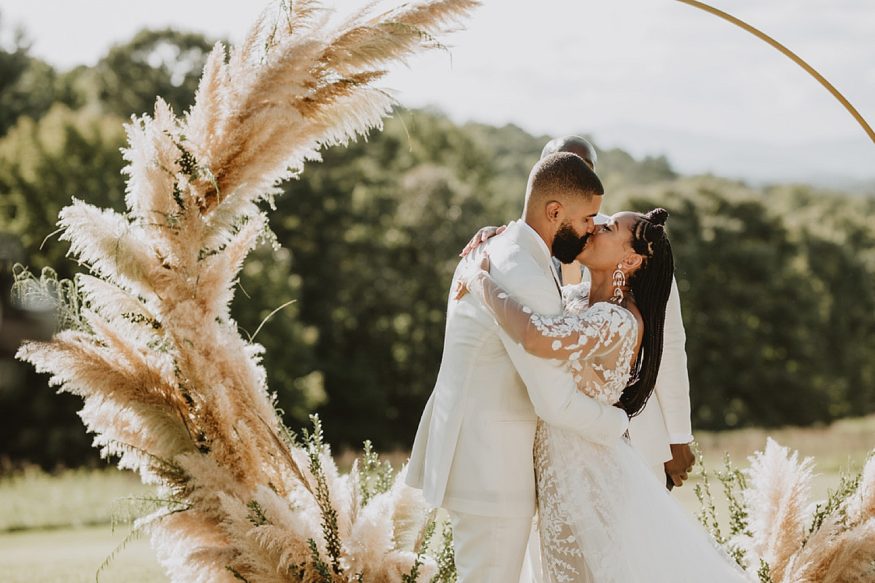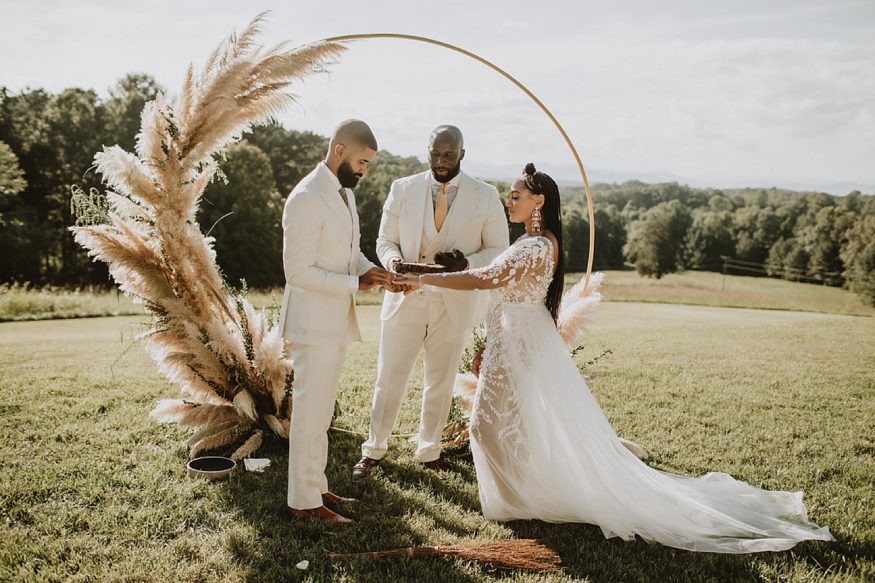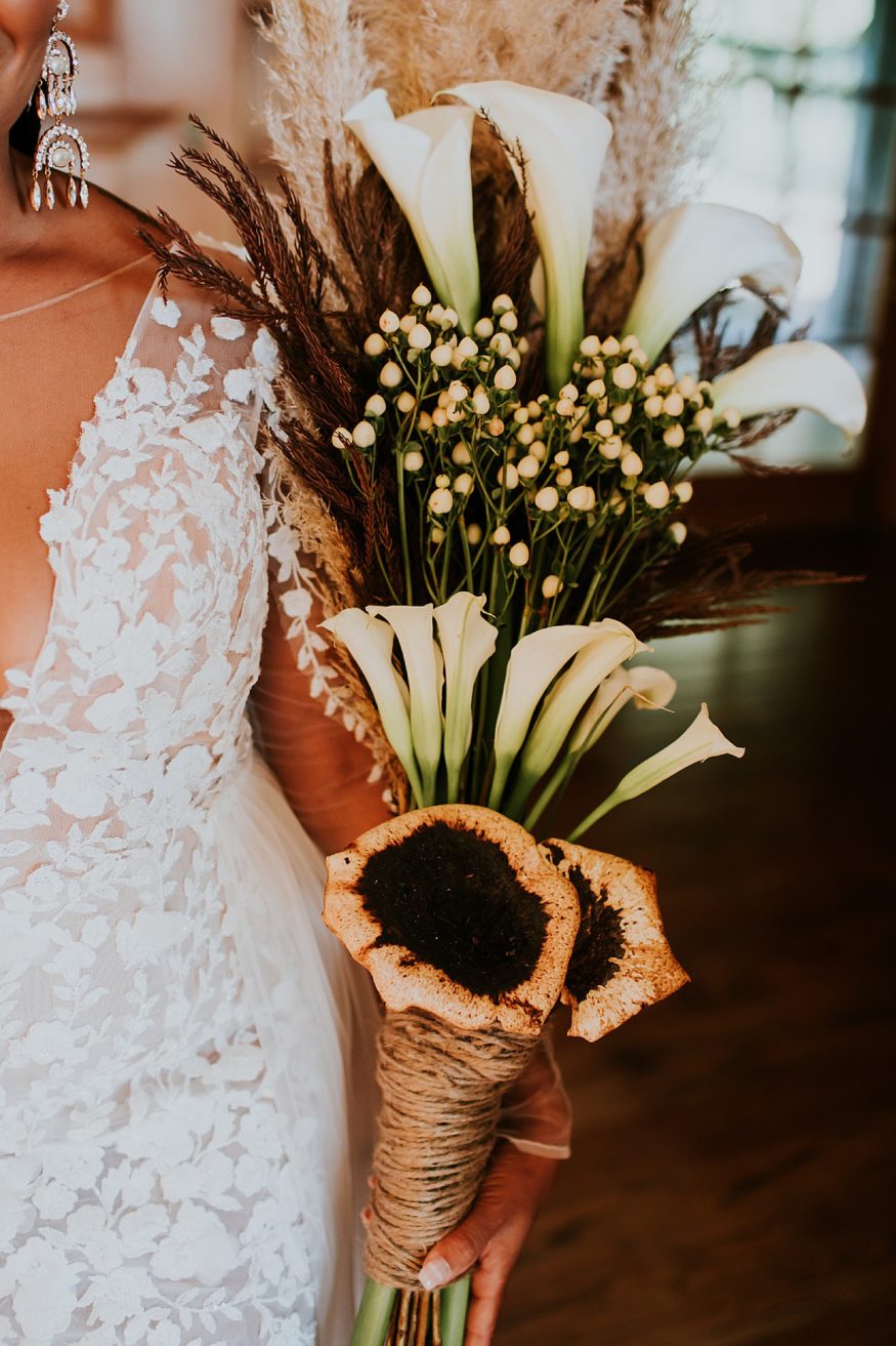A: I used minimal florals for the wedding decor/aesthetic. I made my bouquet the morning of the wedding, using some  of the same pampas grass and flowers that was foraged from the area, including dead pine needles and a set of mushrooms that i’d been admiring for months . I even added a quartz crystal in between the mushrooms in my bouquet. the florals used in my bouquet were calla lilies and cream hypericum.  my girlfriend, Kori Fields, led the build-out of our arch with the help of my tribe.   for our center pieces, we used calla lilies and snapdragons along with some greenery that we foraged.   we gathered a ton of pampas grass and greenery in my neighborhood that we used for the arch and centerpieces as well.