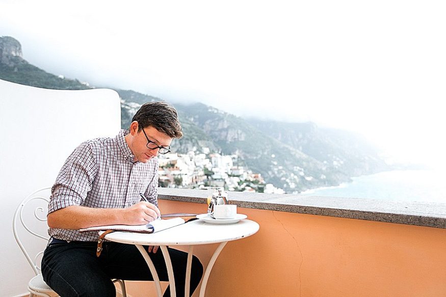 It was all Positano, Italy! I picked the city for our elopement because of the amazing backdrop and rich colors it provided. Blue & white porcelain pottery covers the whole city and it is brightened by lemon trees everywhere you look. The only color I added was rose gold. I have always loved the look of the finish and Jonathan obviously knew that. I was so happy to see my engagement ring when he proposed was made of rose gold, just as I always wanted. I then added more rose gold with all of the jewelry I chose to go with my wedding ring! Also my shoes! I was obsessed with them. They were the perfect shade of Positano blue. Made by Badgley Mischka and covered in crystals!We legally signed our wedding documents in Alabama and then had my little sister preform our actual wedding ceremony in Positano so it would be personal to us. She ended up writing the sweetest ceremony I had ever heard.