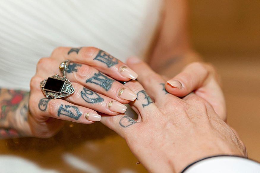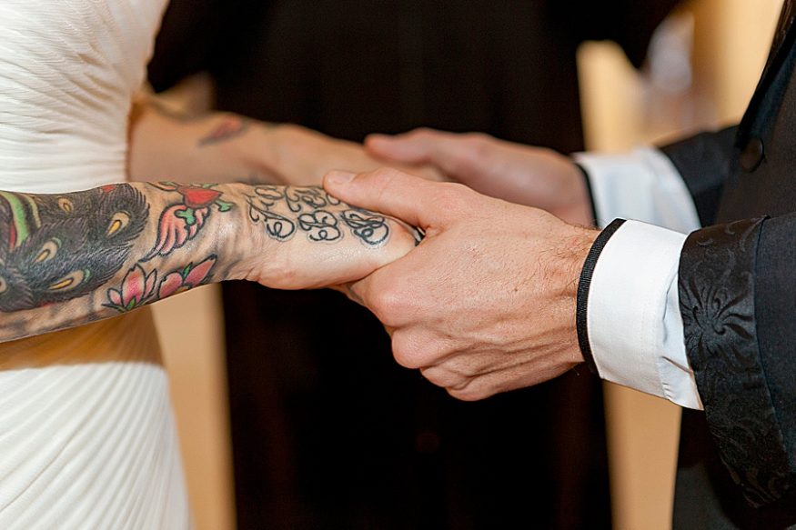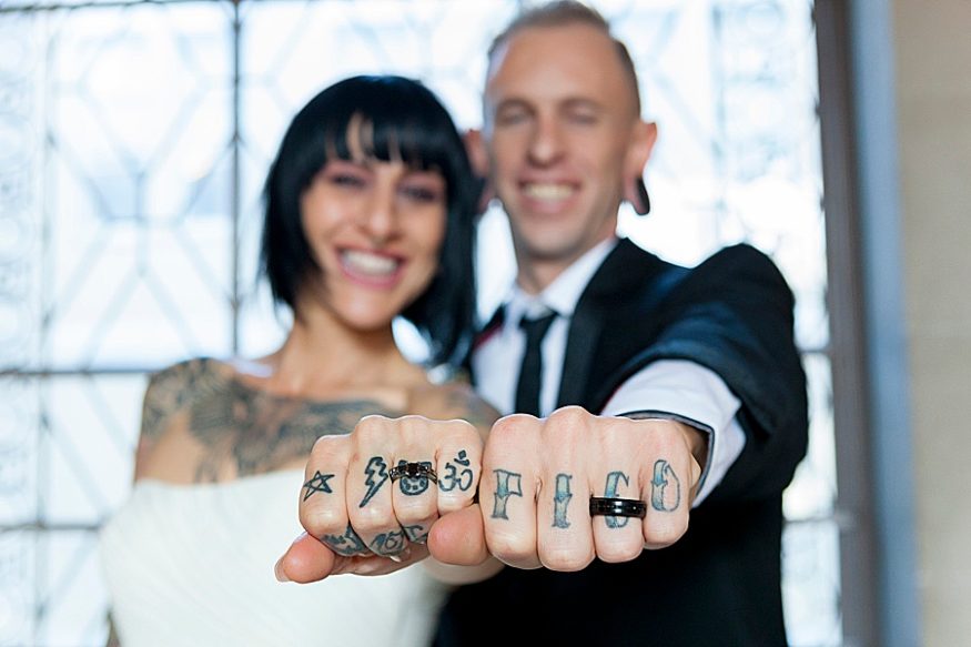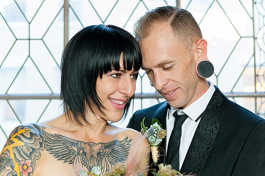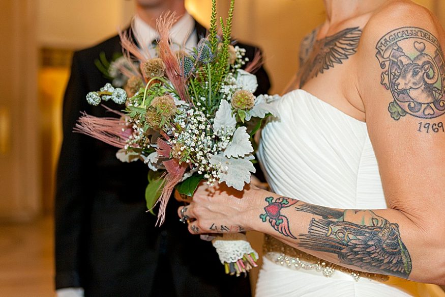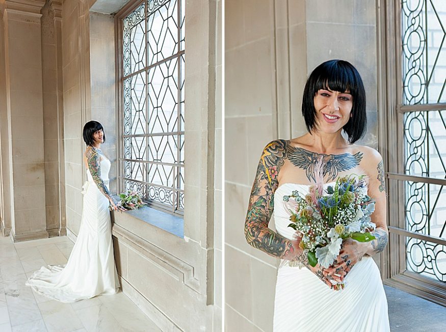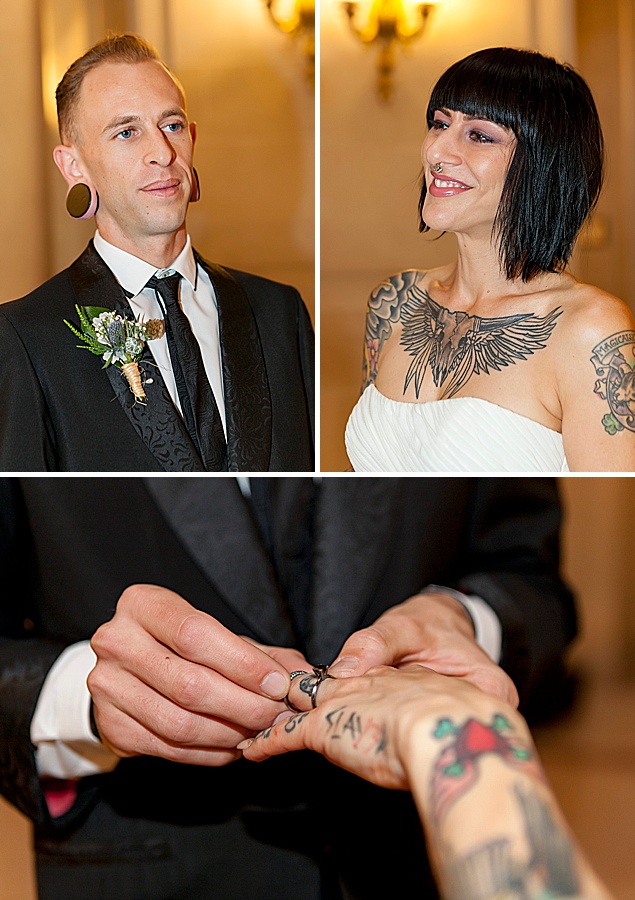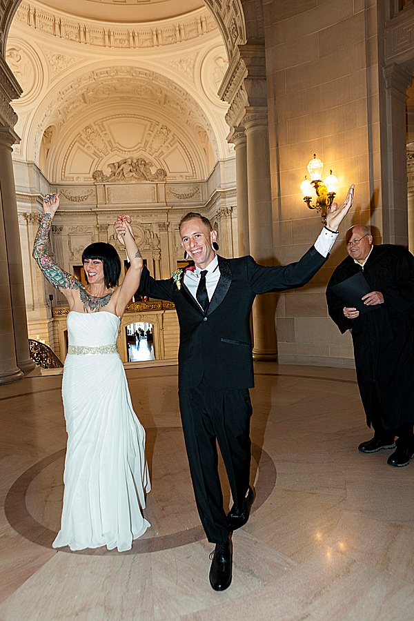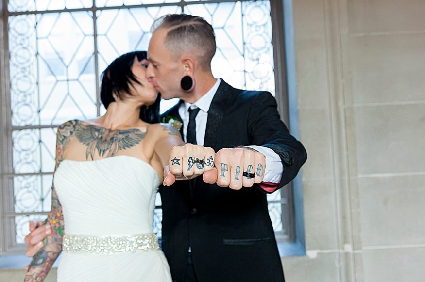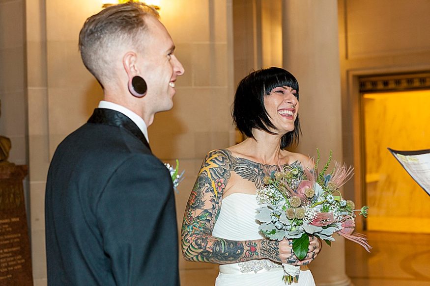 When a costume designer and artist gets married you know it’s going to be good! Yasmeen and Bryce opted to marry at the San Francisco city hall. She told their photographer Rachel that she wanted a “rockabilly, tattoo themed / vintage wedding. ”
