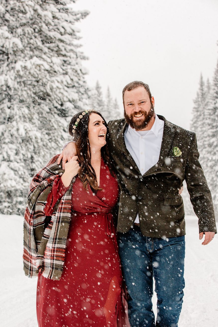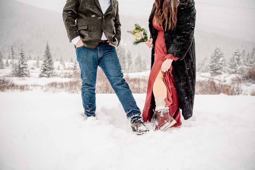 Let’s be honest, weddings cost a lot of money these days, and couples lose site of what is important. It was so stressful trying to get wedding lists together, looking at the cost of everything, and ultimately cutting the guest list to afford what we wanted. So eventually we decided let’s just elope! Colorado allows couples to marry themselves without a witness. We decided that ultimately our marriage was about each other, so let’s take this moment to focus on each other. Our photographer, Emmy with Searching for the Light & Celebrate Again made eloping pretty easy. We selected a location with them, and Emmy made sure to find out if we needed permits or schedule times with the National Park Service. The only stressful part was finding a dress last minute. Long White Dresses in a specific size are not easy to find. So this is why I chose a color! But ultimately, to elope in the winter, you still need to roll with the punches, or maybe avalanches. Our ‘venue changed’ last minute! We chose to elope on top of Loveland Pass, however leading up to the wedding there was a large snowstorm that closed the pass and even caused an Avalanche! So the morning of the wedding I went to the front desk at Keystone Lodge and Spa and explained to the manager about our predicament, and they let us know exactly where to go! So our photographer Brittany went on an adventure with us to find a new spot, and we ended up at Peru Creek east of Keystone near Montezuma, CO and just walked up and found an awesome spot to by the trail head!