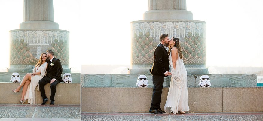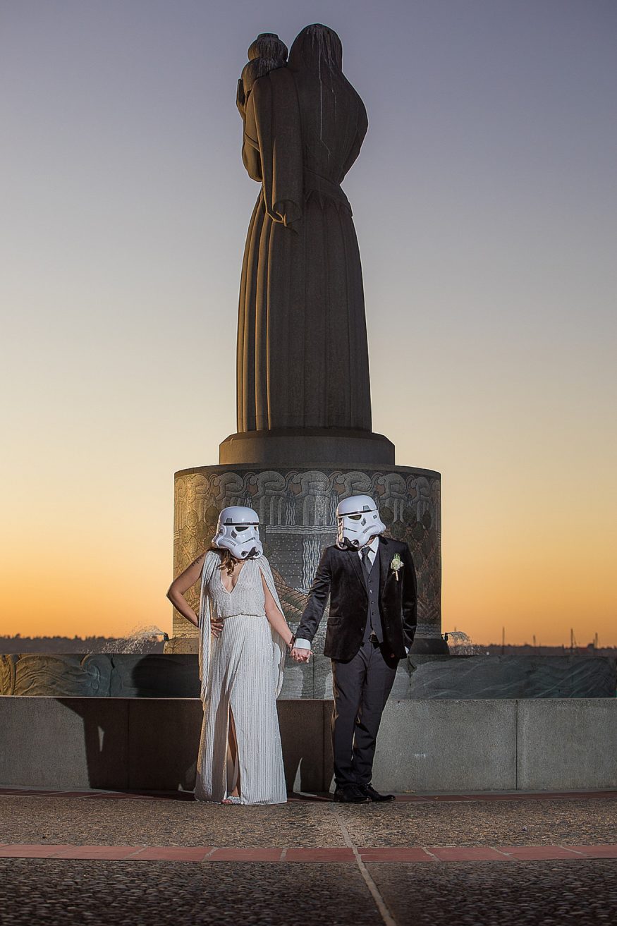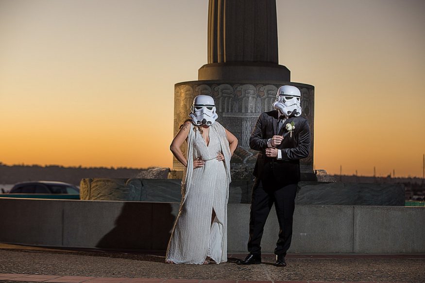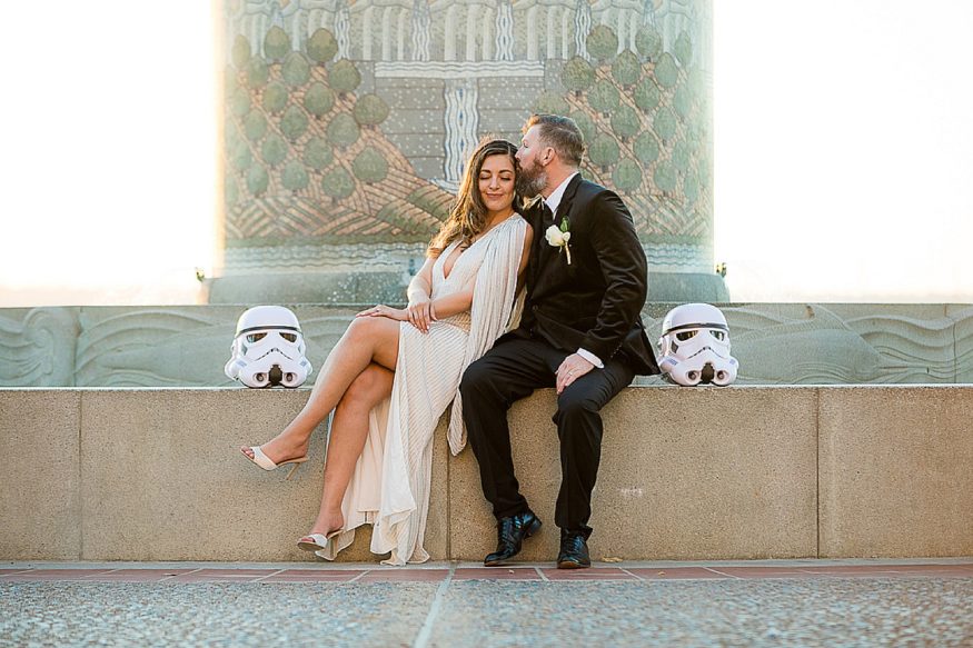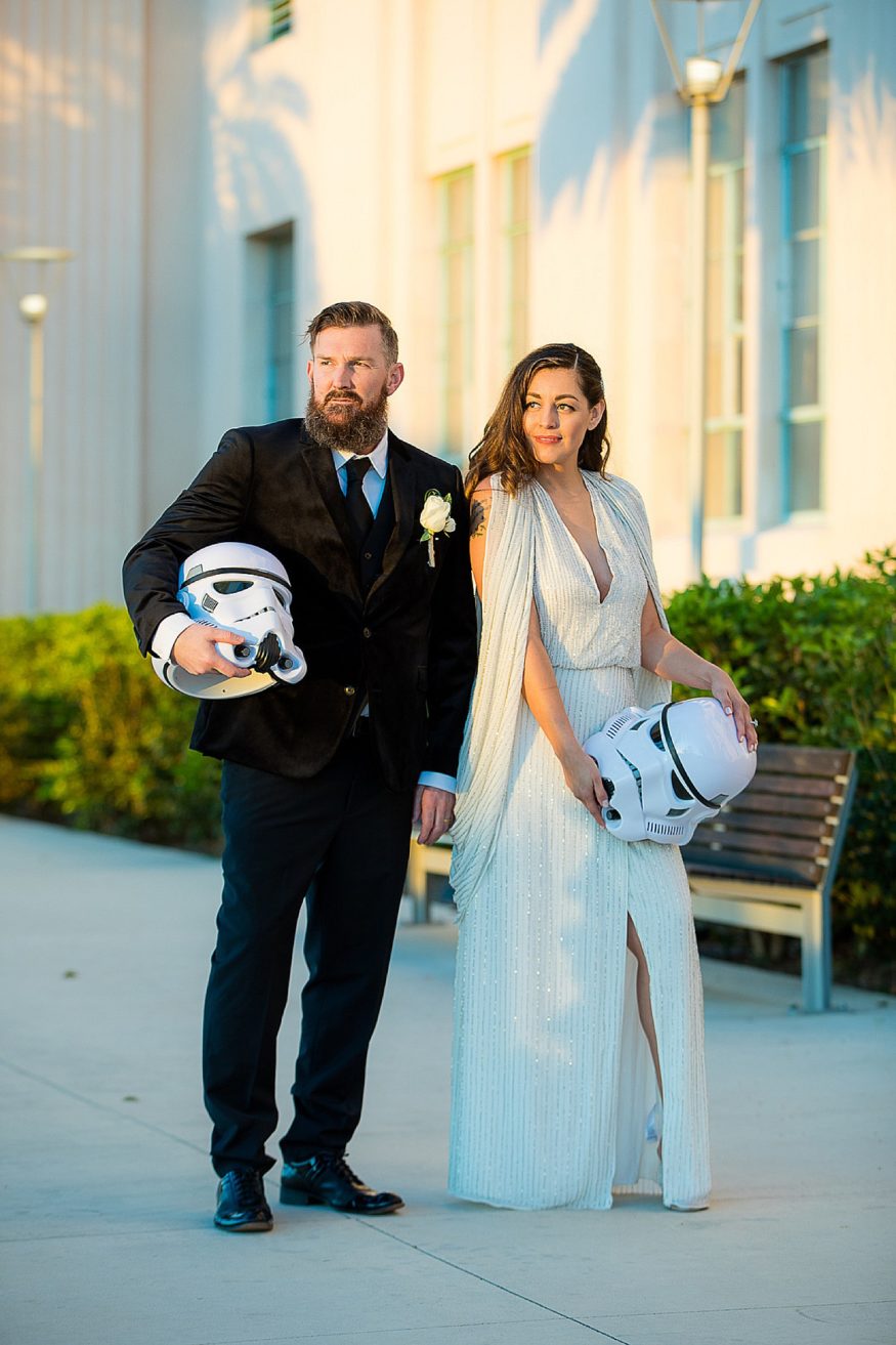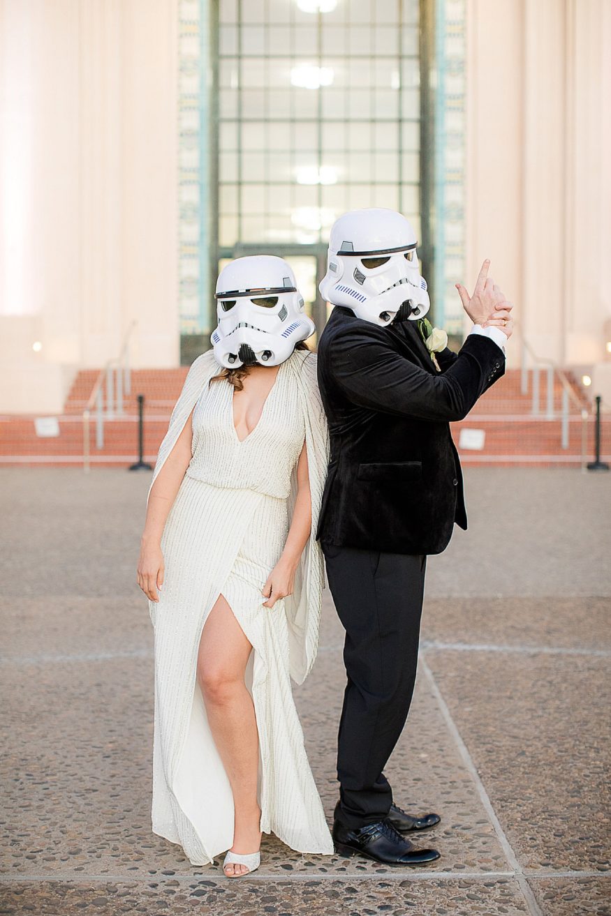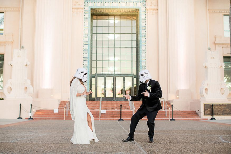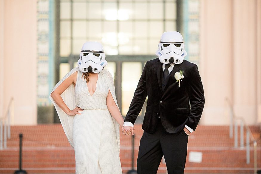 A May the Fourth wedding that should have been, but the pandemic had other ideas. Since the whole world was shut down in May 2020 they had to wait a bit to say I do and decided to go to the courthouse instead of their original plans. But they were sure to include some Stormtrooper helmets as a nod to their original date.