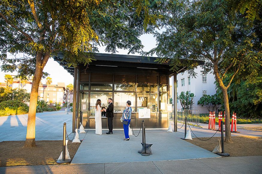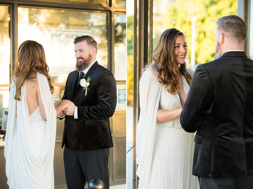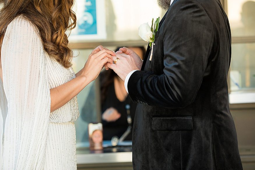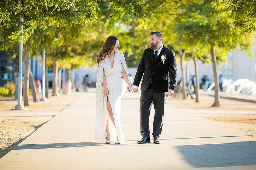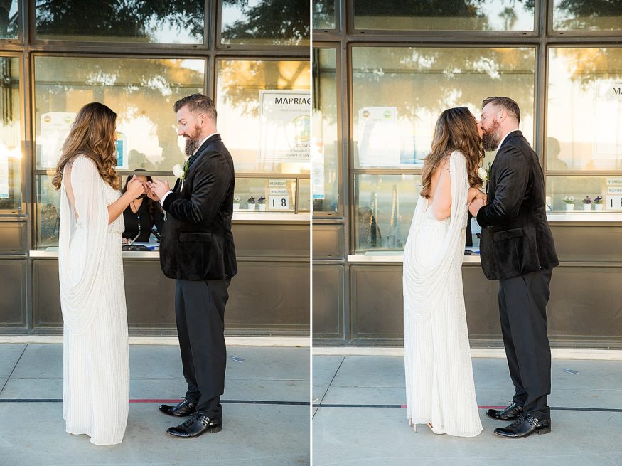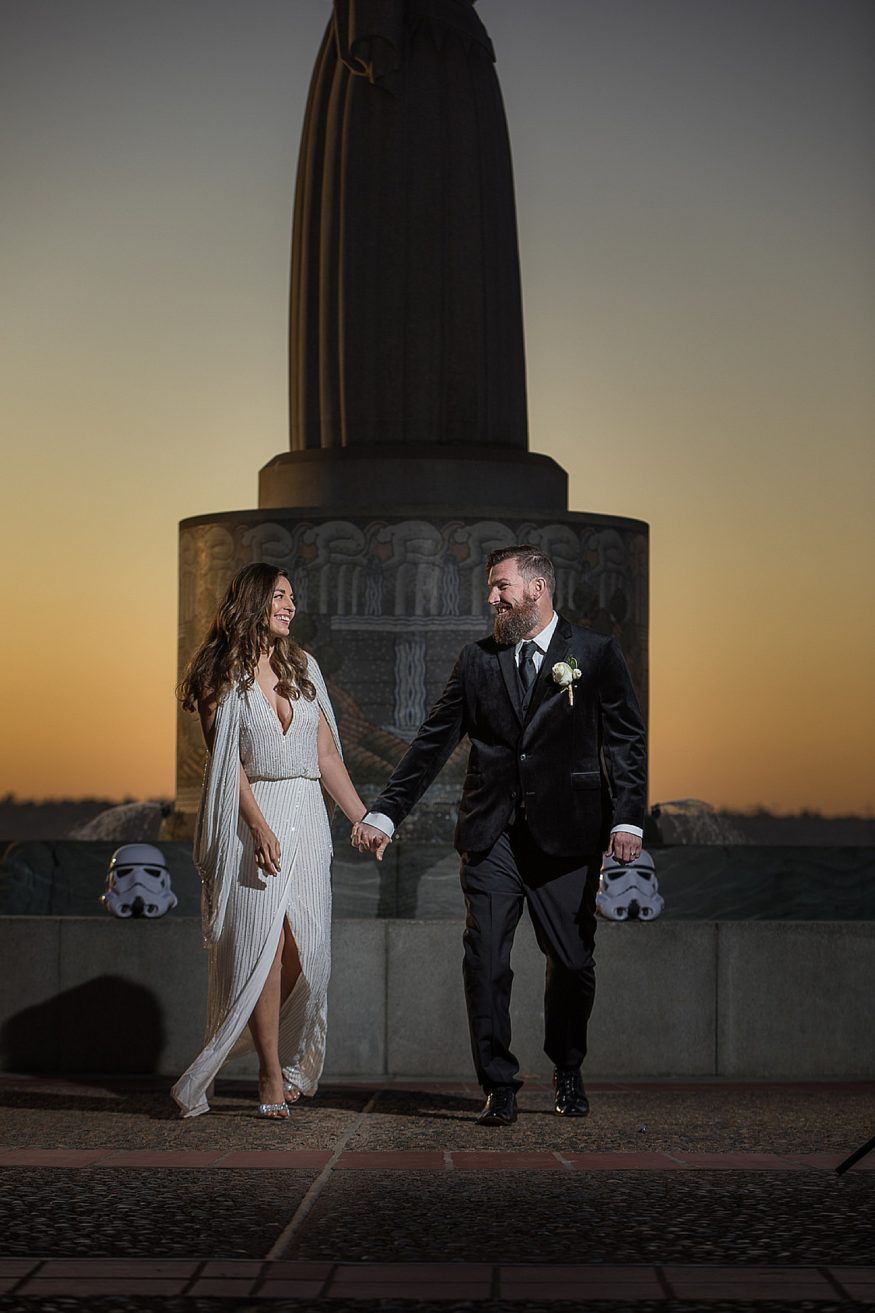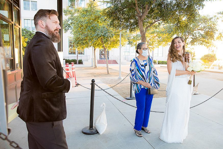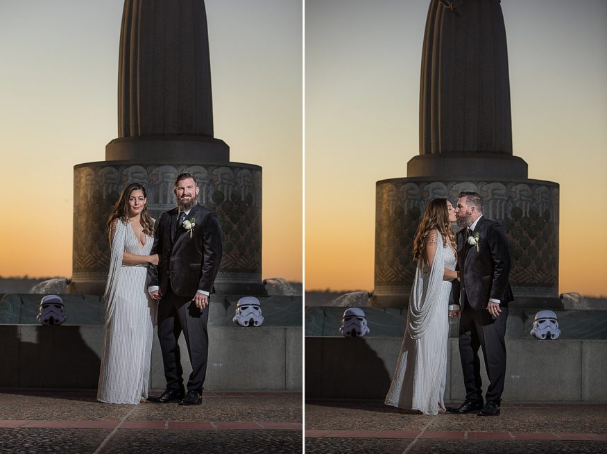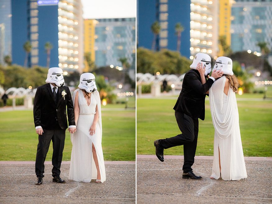 A May the Fourth wedding that should have been, but the pandemic had other ideas. Since the whole world was shut down in May 2020 they had to wait a bit to say I do and decided to go to the courthouse instead of their original plans. But they were sure to include some Stormtrooper helmets as a nod to their original date.