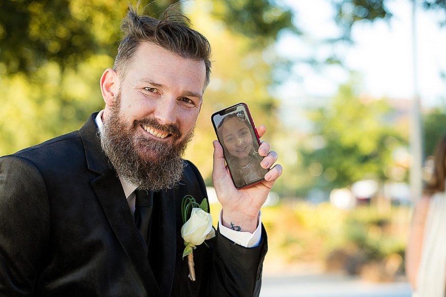 A: Bill – I went with a black velvet suit coat, cause I wanted to be a little formal but still have a bit of flare. Plus the black helps hide my extra quarantine pounds! She wore an elegant, ivory beaded wedding dress with a plunging neckline and draped sleeves. She was a vision. Absolutely show-stopping.