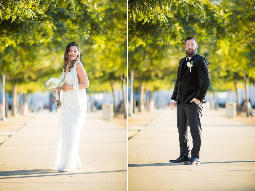 Q: Let’s talk fashion. How did you both choose your wedding day look?